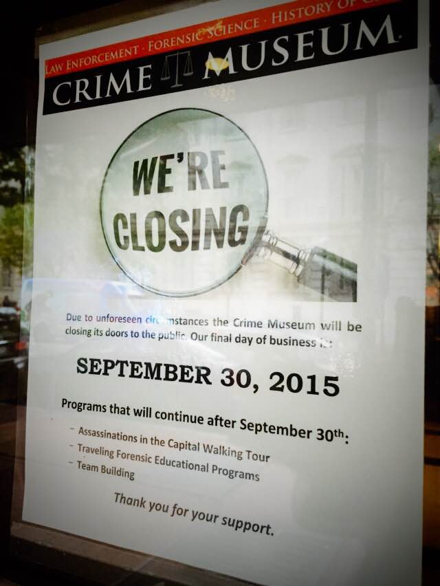 Distracted on the way to the next Smithsonian building, I stumbled upon the privately owned Museum of Crime and Punishment. Well, that’s different! I was braced to see something shocking, but I’d have to pay $21 to do so, in a city that is full of FREE (government funded) museums, galleries and performances. Perhaps that’s why the sign on the door warned that “due to unforeseen circumstances” the museum would be closing its doors to the public . . . that day! With only an hour left before the big closing, I thought I’d work on the museum staff; they were a bit scattered, as you can imagine. The teens were unwilling to waive the high priced entrance fee so I could take a quick peek, so I did the next best thing; I meandered around the lobby, concession stand and gift shop.