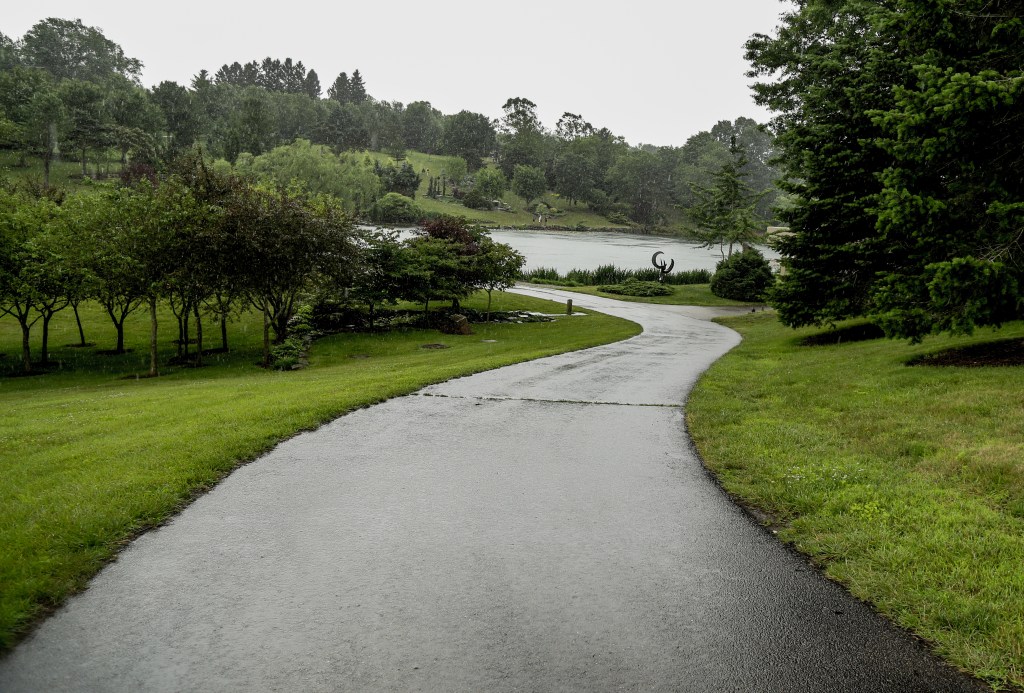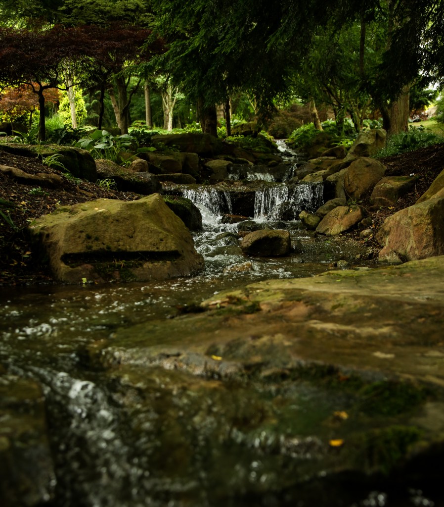 Seated on a moss-covered stone bench, I was listening to the trickling sound of the creek, down below me, on the lower hiking path through the woods. There were bits of sunlight spilling into the open meadow, to my right, between patches of overcast sky that threatened to pour rain onto visitors.