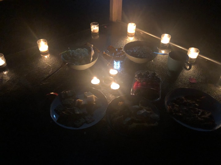 Dinner by candlelight was a treat for us, on the cabin deck; our table was ringed by tealight candles. A simple meal of extra sharp white cheddar cheese & crispy crackers, mixed berries, and spicy dip on multigrain chips – a picnic in the woods.