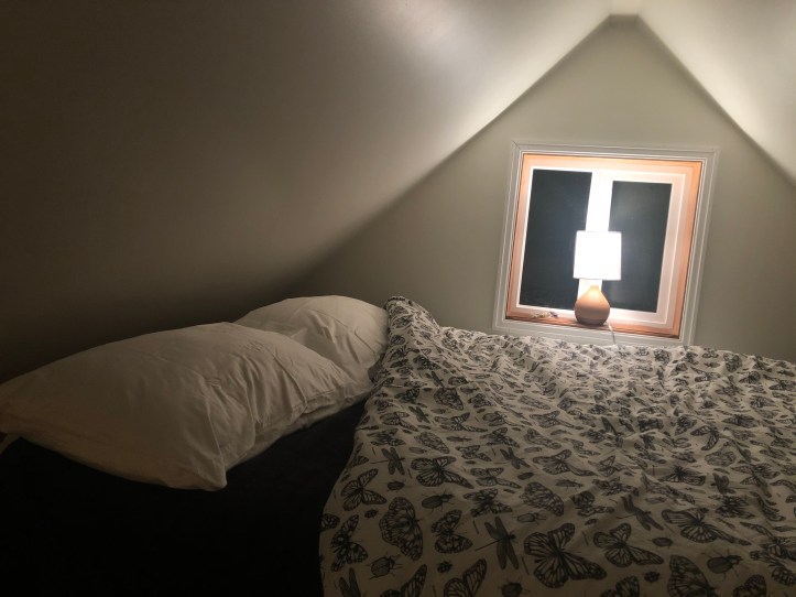 I didn’t mind the rain one bit – especially lying in bed, in the cabin’s loft, windows open and a slight breeze drifting in, scented by the height of fall, smoky firewood, and wet ferns. We’d taken the wooden folding ladder off the cabin wall, leaning it against the edge of the loft; I climbed up and settled in. I was tempted to stay up there all afternoon.