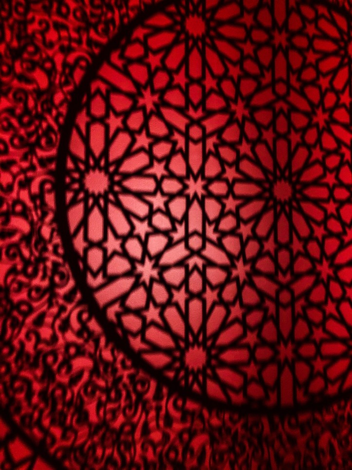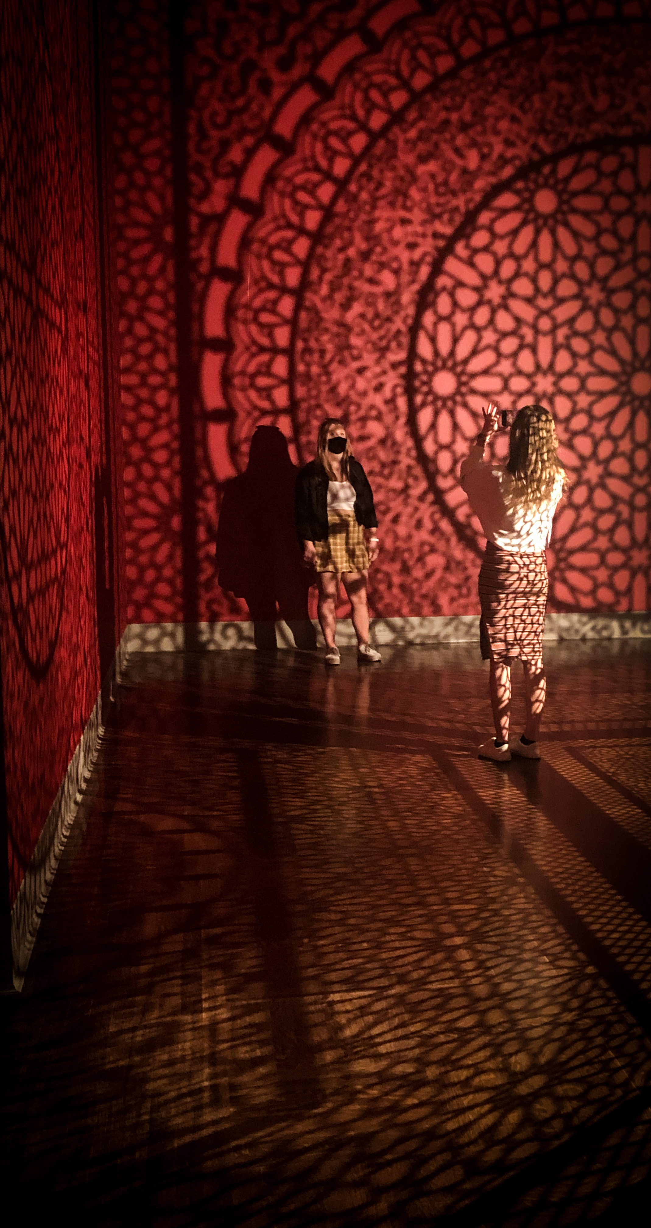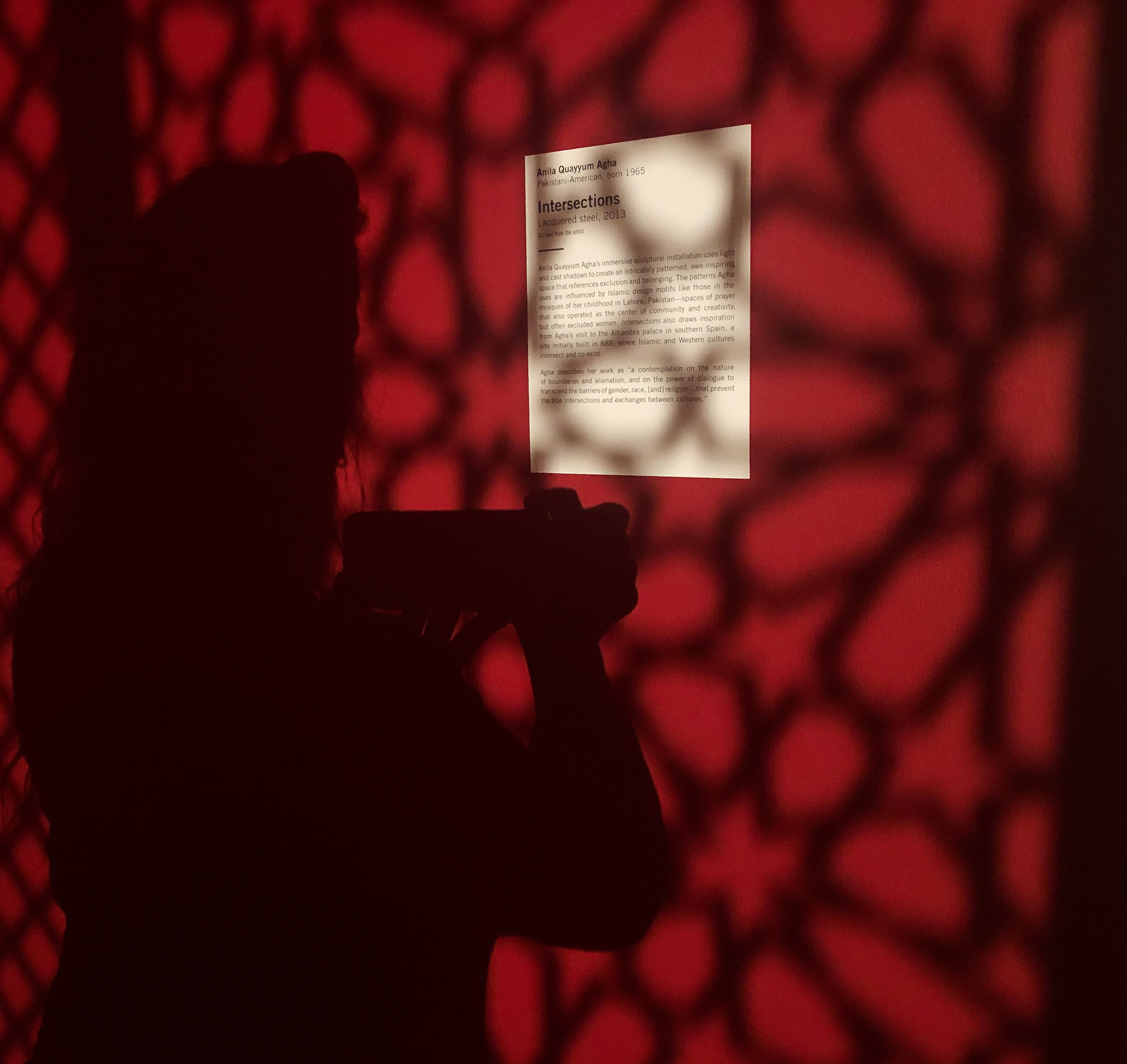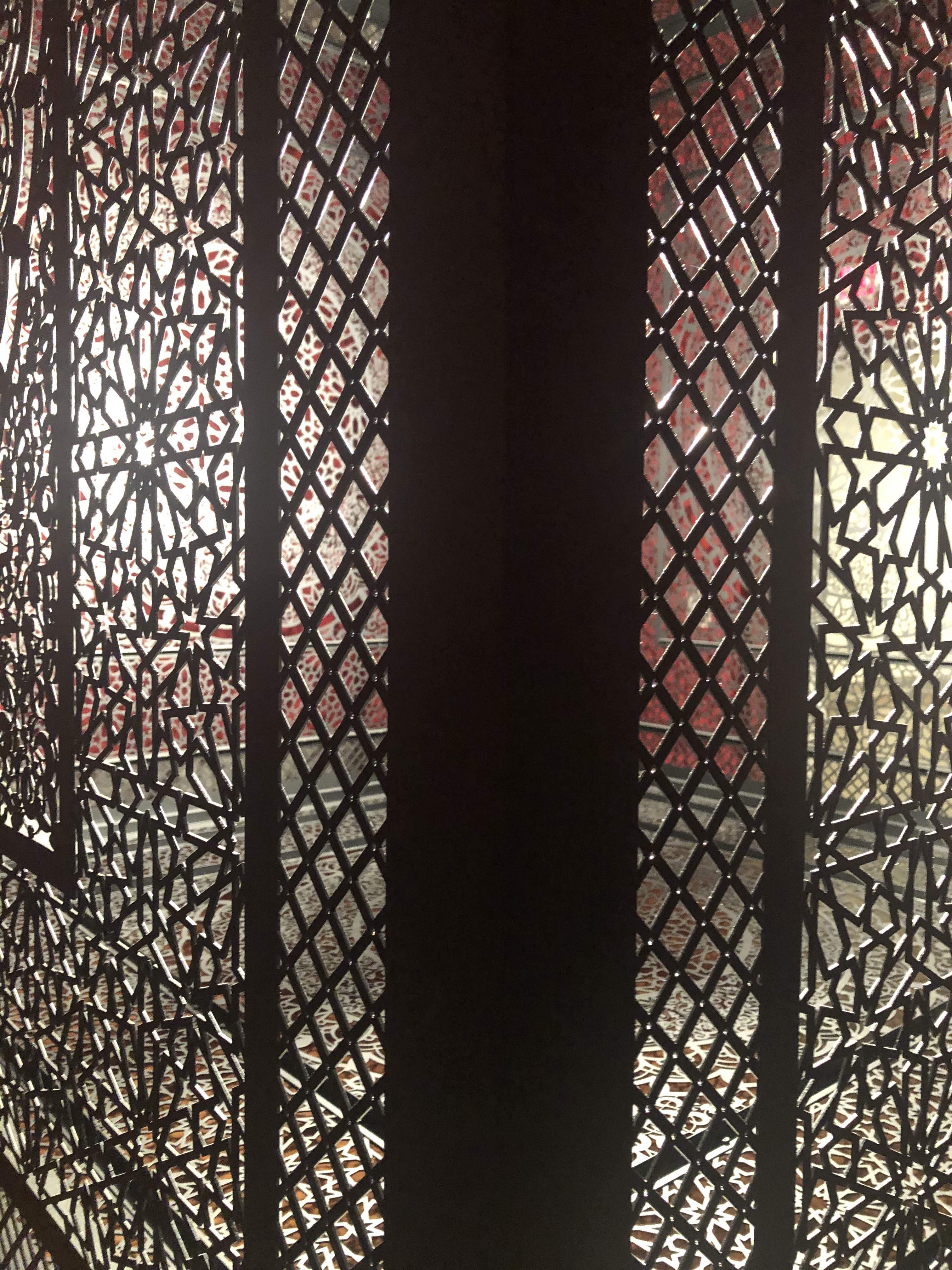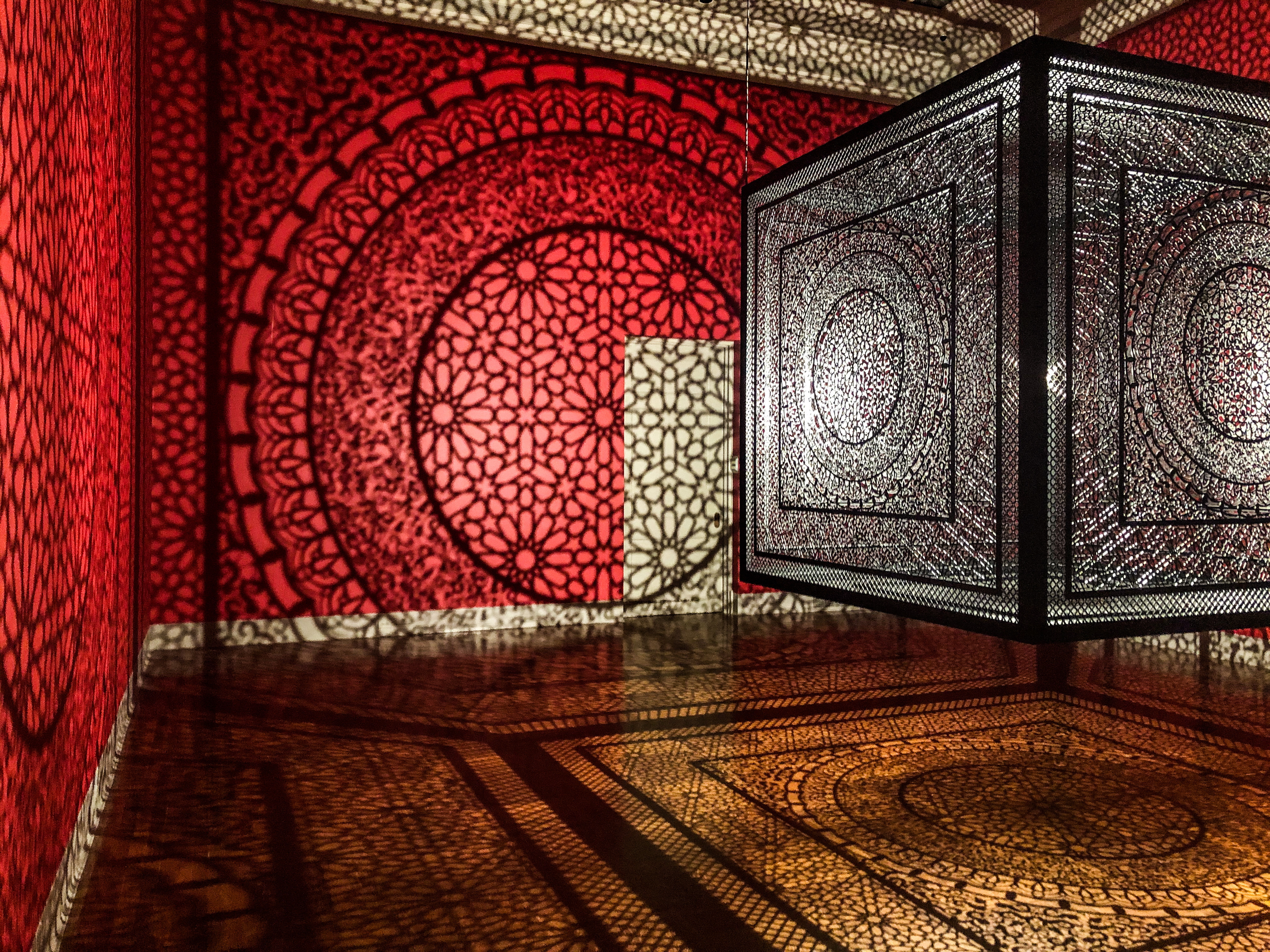Fabric artist Anila Quayyum Agha, responsible for the piece, uses shadow and light to create intricate patterns, reminiscent of those on fabric pieces. Yet this is on a much larger scale. Her work is inspired by Islamic geometric designs and interlace patterns “The walls of the cube showcase Moorish patterns inspired from the Alhambra,a place where Islamic and Christian worlds intersect.”[9]