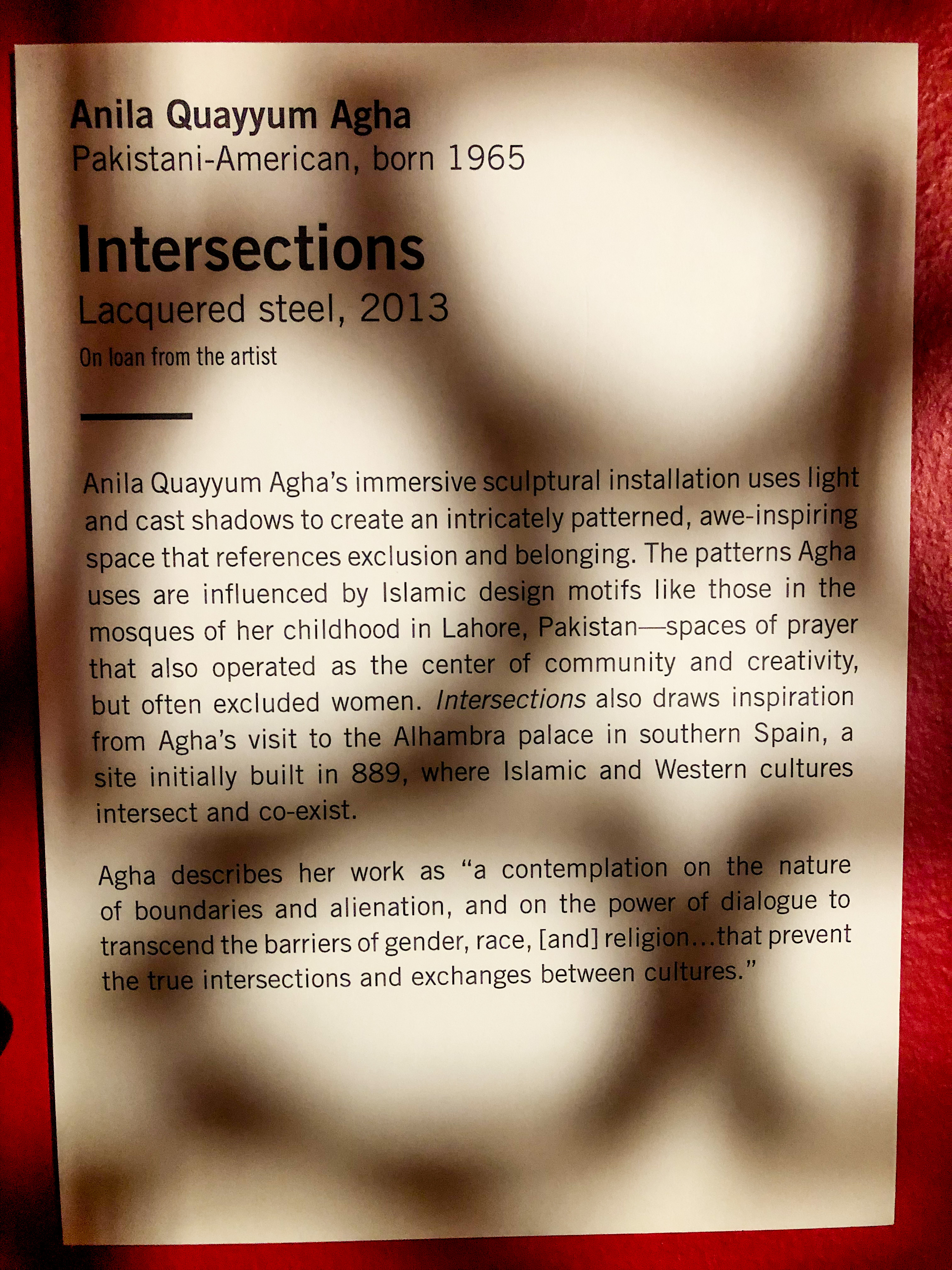 Trying to read the sign on the wall, I notice my own shadow, interlaced with the shadows of the art piece. I could stay a while; I do stay a while, to take it in. As a result, I miss seeing parts of the museum. But I’ll be back another day, and I’ll be sure to visit this room again; perhaps I’ll begin my visit there.