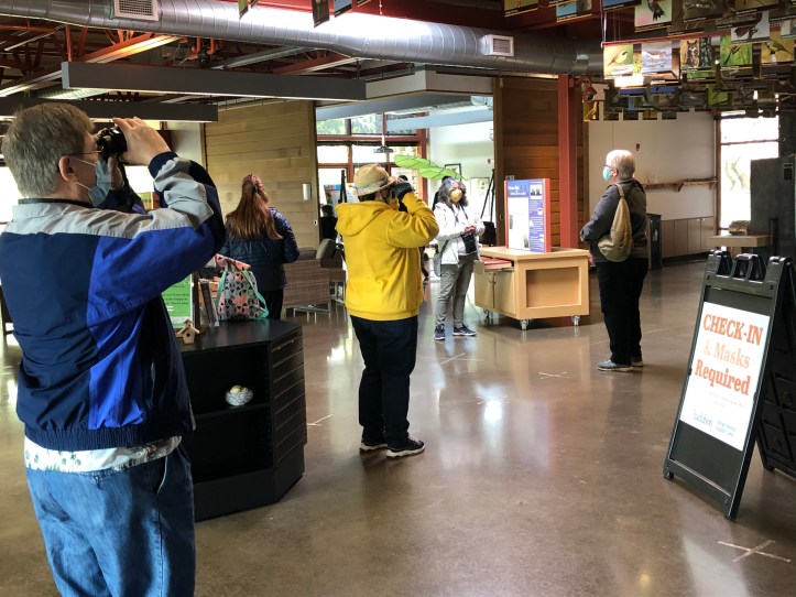 I let myself into the building. There were marks on the floor, letting visitors know where to stand. And there they were – an excited group of novice birders, standing six feet apart, learning the basics of how to use binoculars, together. Who thought group learning could be such a delight?! Questions were asked, and answered, in real time. The person leading the group was visibly delighted to be encircled by likeminded bird enthusiasts.