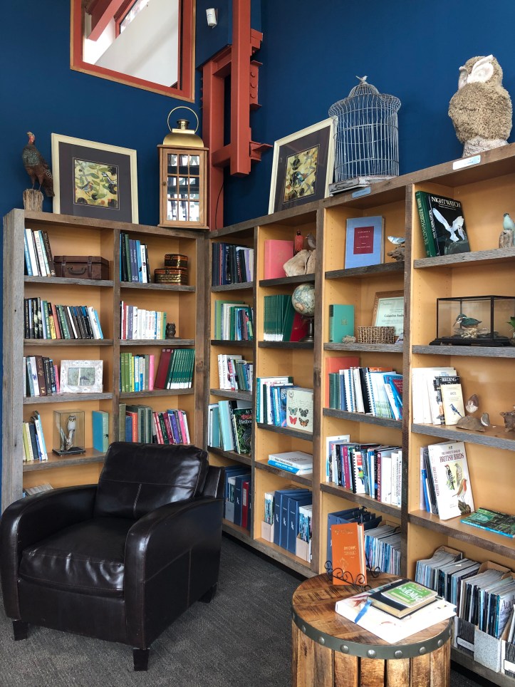 The chattering sounds of birds at the feeder, just outside the windows, are piped into the bird-themed library. What a delight it would be to have a room like this in my home, with volume after volume dedicated to nature and birds. You could spend a lifetime and not read it all. Small displays of bird-themed trinkets, framed prints of common bird species, and a large selection “Wildfowl Carving Magazine” back issues also decorated the shelves.