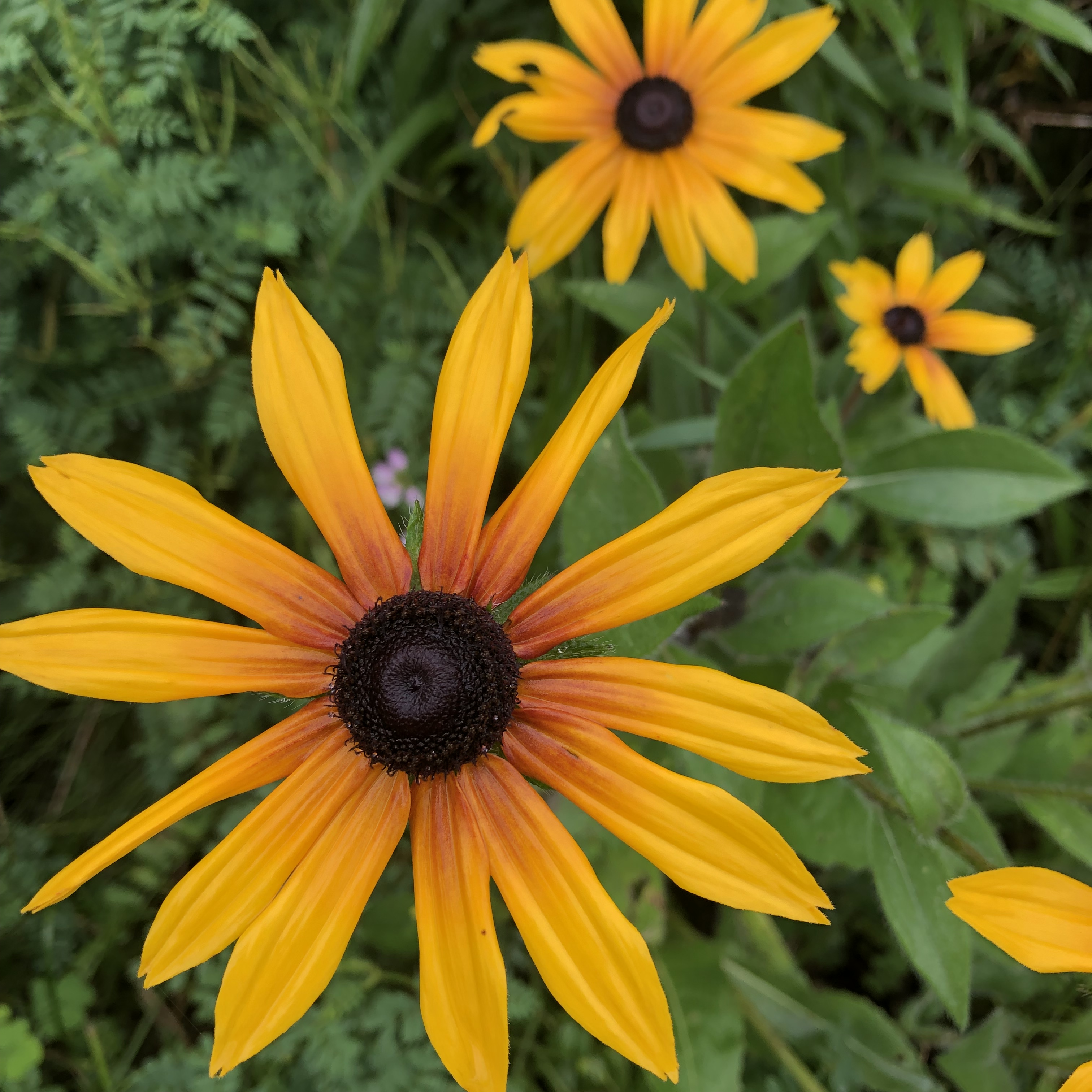 A bright yellow patch of Orange Coneflowers might catch your eye. If you slow your pace, and start taking a closer look at this meadow on a rainy day in July, the vibrant palette of flowers seems endless. Standing quietly for a moment, looking into the grasses along your path, you’ll be struck by the diversity of color you’ll see. Plants abound, and are joined by insects, including pollinating bees and butterflies.