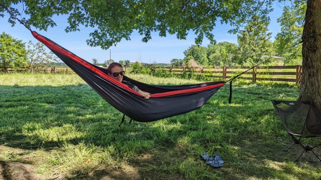 . . . unless you’re interested in bringing along your larger tent, queen-sized air mattress, bed pillows, hammocks, camp chairs, metal dishes, cooler, and enough food and water for the weekend. I was fortunate to have a friend meeting us at camp; she offered to transport the equipment for me. Perfect! It’s the best of both worlds! Let’s face it – it’s “Glamping.” My friend is an experienced luxury camper; she brought the watermelon!