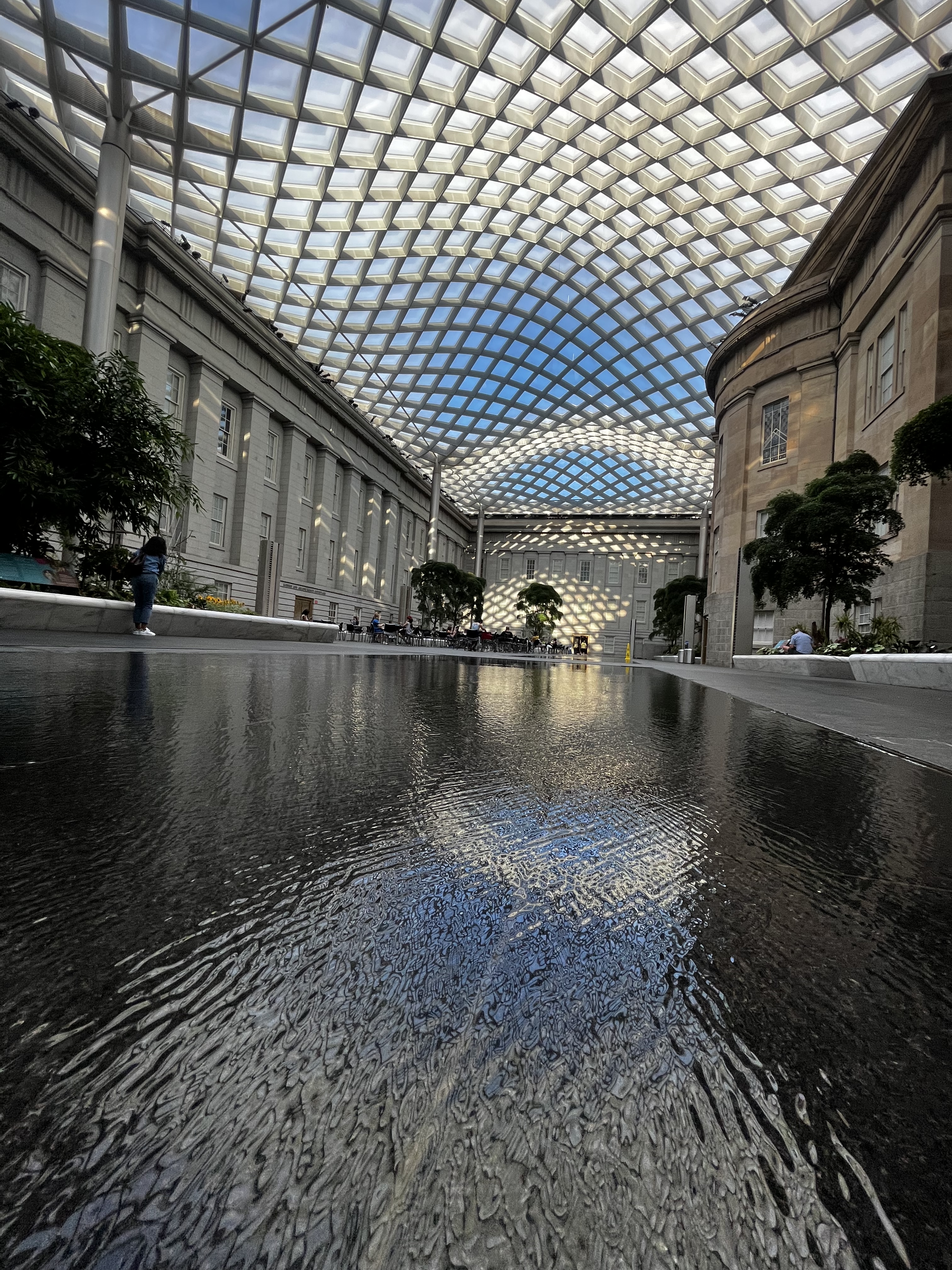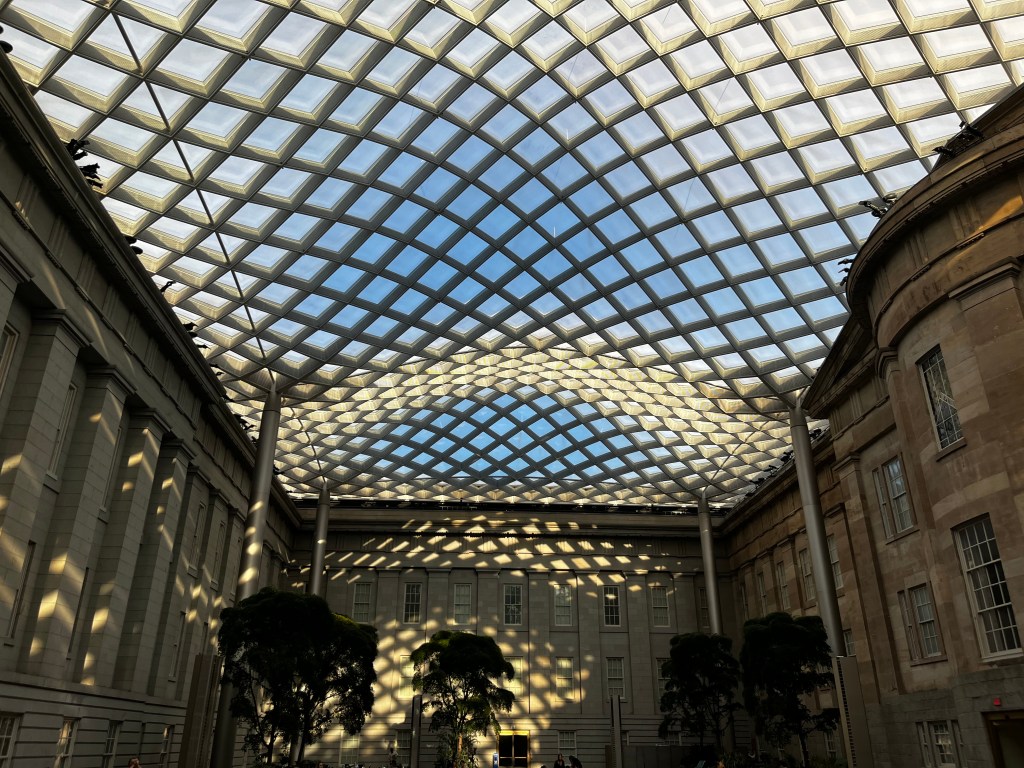 “The enclosed courtyard with its elegant glass canopy, designed by world-renowned architects at Foster + Partners in London, provides a distinctive, contemporary accent to the museums’ Greek Revival building. The wavy glass-and-steel roof that appears to float over the 28,000-square-foot courtyard lets in natural light but protects visitors from the elements.”