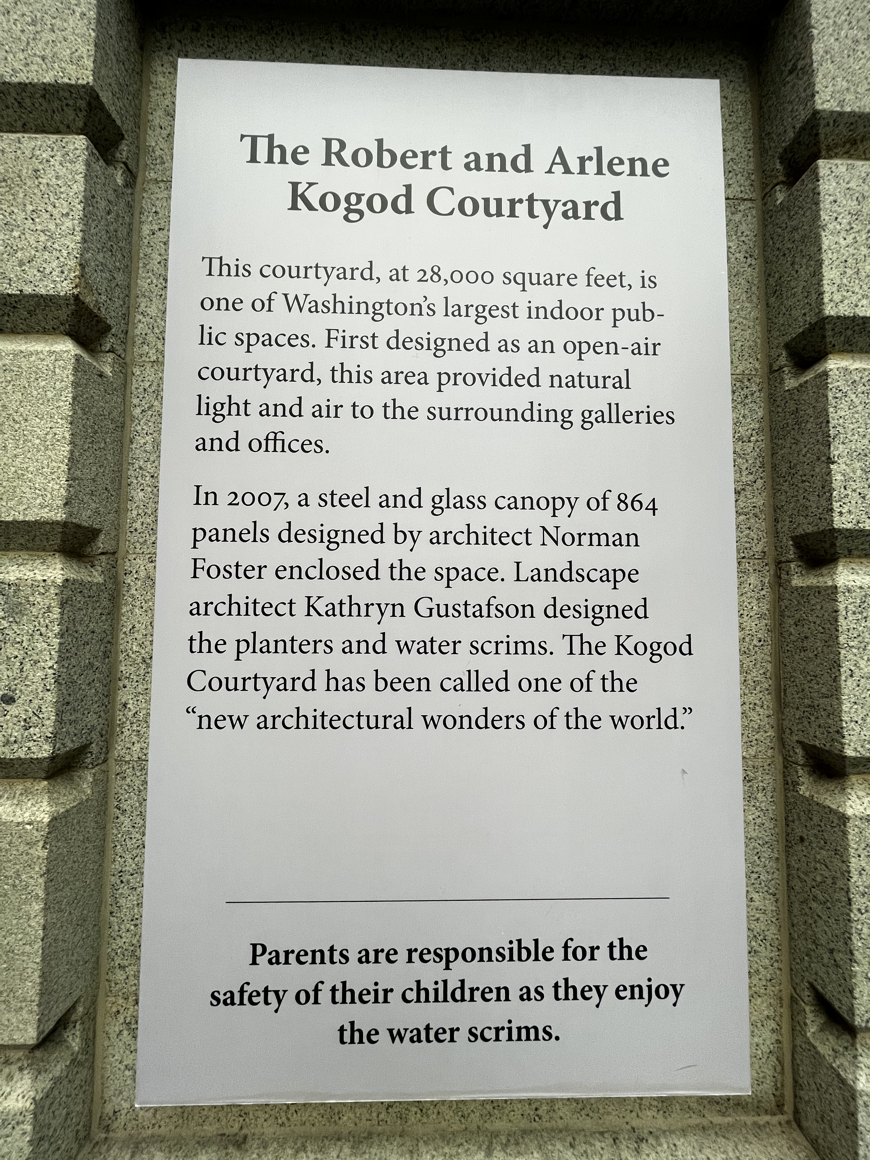 “The Robert and Arlene Kogod Courtyard, a signature element of the renovated National Historic Landmark building shared by the Smithsonian American Art Museum and the National Portrait Gallery, opened to the public on November 18, 2007. The courtyard is named for Robert and Arlene Kogod, Washington philanthropists and art collectors.” (SAAM website)
