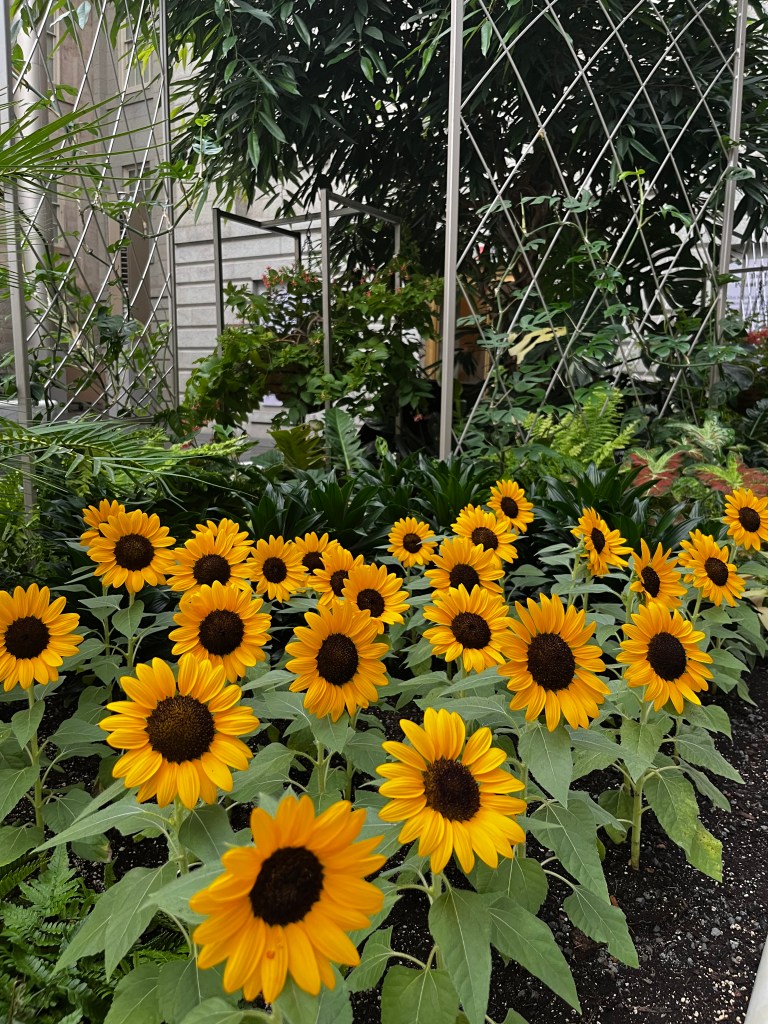 I love the idea of bringing nature inside . . . and getting ourselves outdoors, out into nature! I stop to reflect – “Only recently have we begun to analyze the reasons why we feel the need to connect with nature.” Indeed! Schools, hospitals, office buildings, and museums join in the effort to keep us connected to nature. And sometimes they succeed. We breathe in the smell of damp soil, we reach out to caress the soft, smooth leaves of a flowering plant, and we are comforted by the nearness of nature. The sunny, sweet rows of yellow sunshine flowers makes me grin.