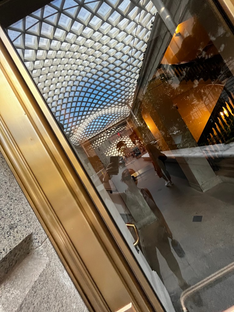 I was so taken with the whole experience, gazing up and around, that I walked directly into the water feature – splish, splash! I stopped cold, took a couple of quick steps backward, and stopped to admire the shallow pool of water moving across the floor and reflecting the entire atmosphere. Just stunning!