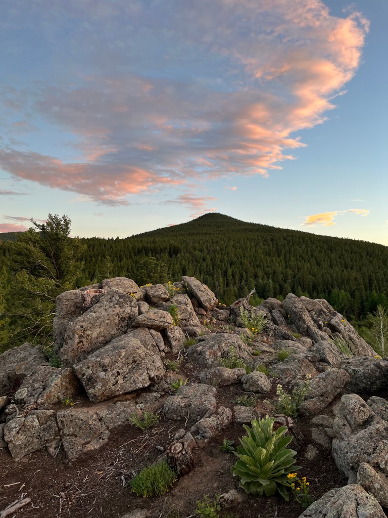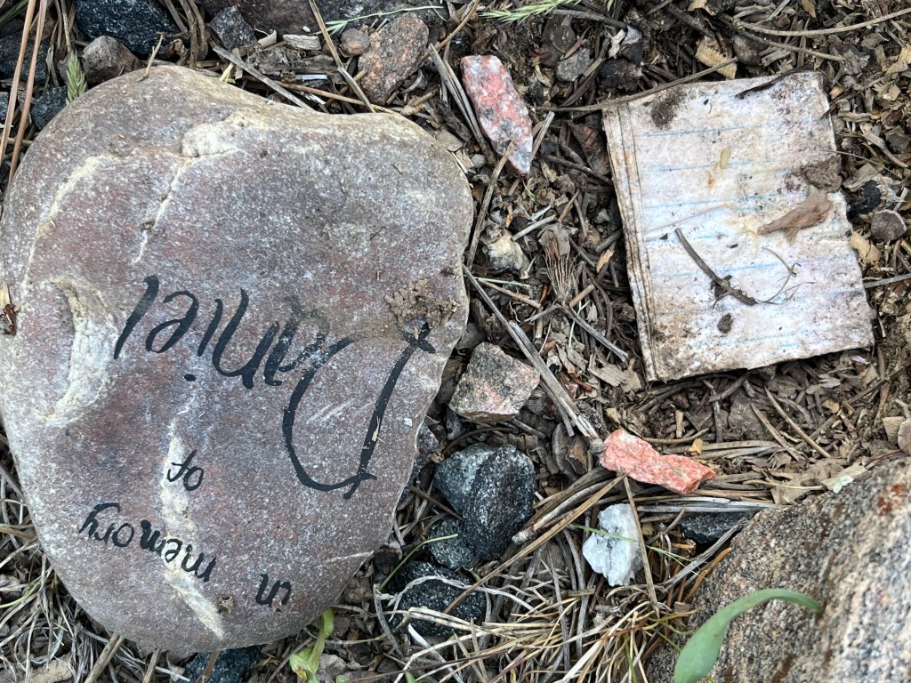 I have to remark on this painted rock that I discovered, along one of the rocky paths that cut through the Shoshoni campus. The yellow sun against a pale blue background caught my eye. Wanting to take a closer look, I turned the rock over, intending to pick it up to feel its weight and admire its details. On the bottom of the rock read “In Memory of Daniel.” A tightly folded paper was tucked under the rock — I can only imagine that it is a loved one’s hand-written letter, a message to Daniel. Not wanting to intrude, I replaced the rock, admiring it where it stood.