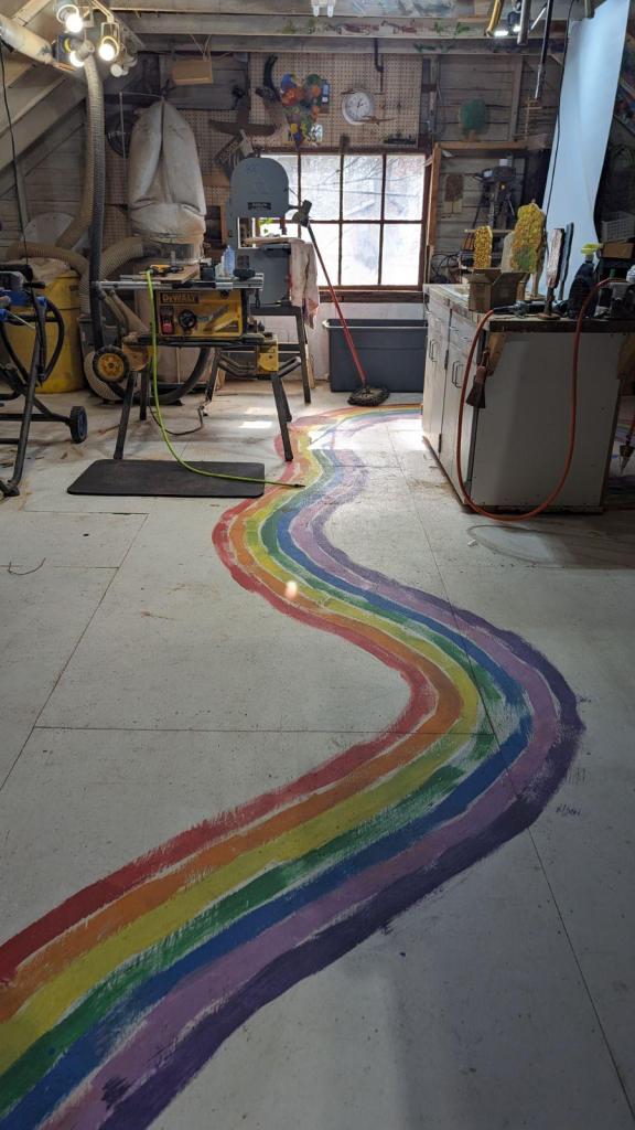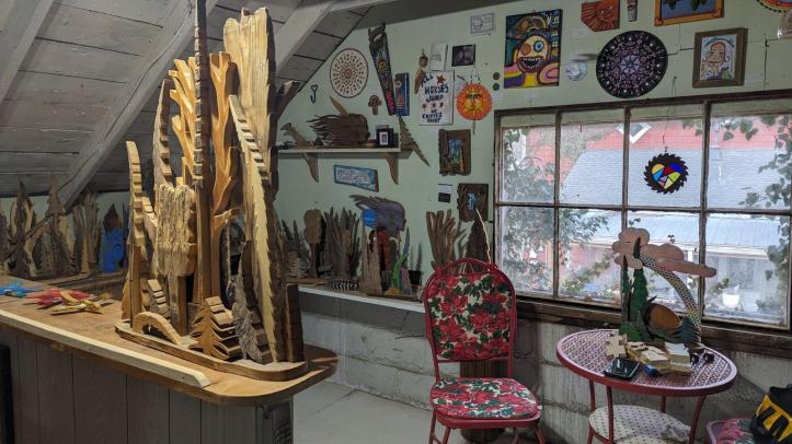 Have I brought enough trees into my environment? Never! I forgot to mention the “screaming” pine tree, its mouth formed where the knot in the wood (remember the “knotty pine”?) has fallen out. Jon infuses the 1-foot tall tree displays with personality! This spring I’ll likely be visiting John’s studio once again; I just saw a Facebook post about tiny trees on metal stakes, meant to adorn a growing fairy garden that has sprung up in our backyard. I can’t wait to tell the fairies!