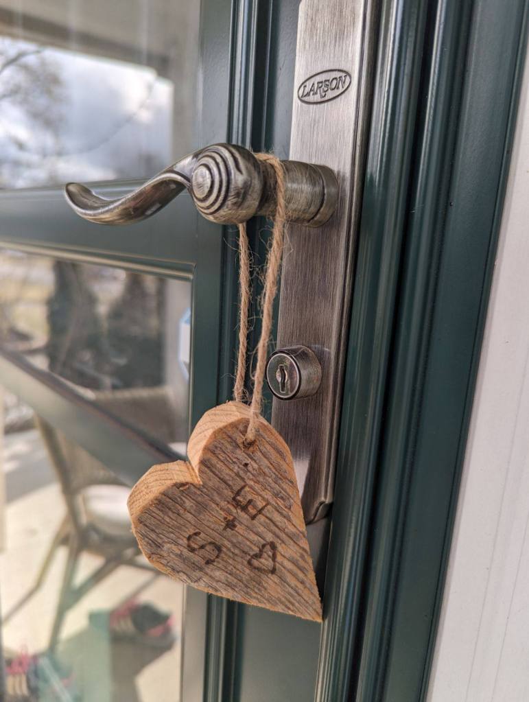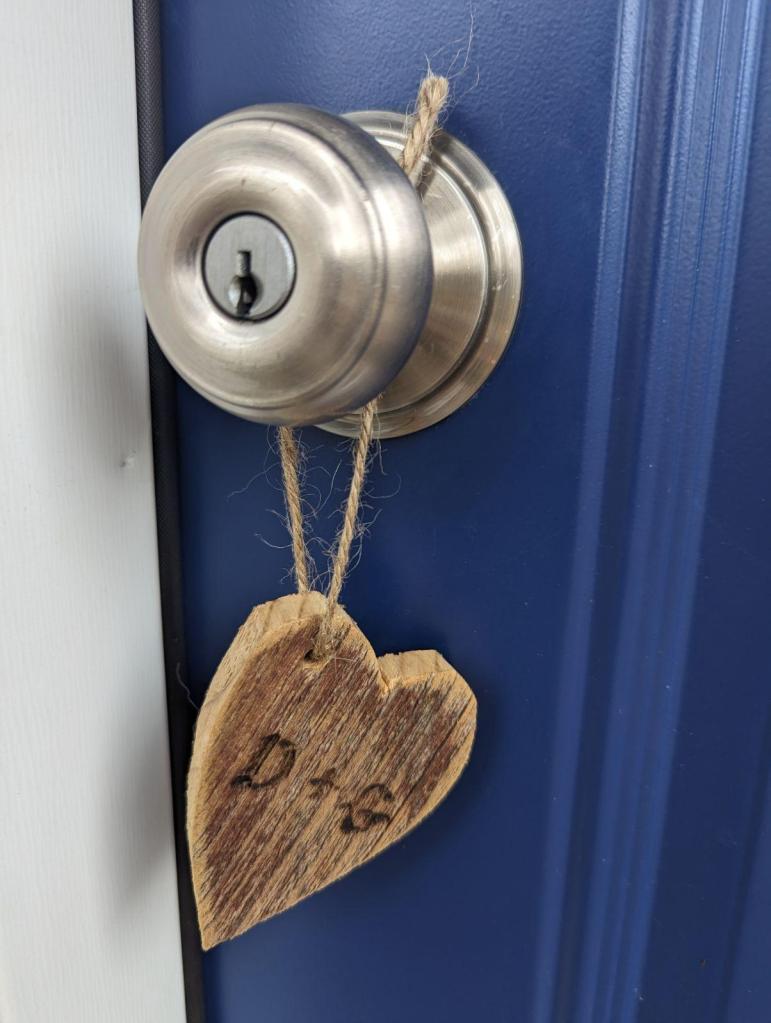 With Valentine’s Day quickly approaching Jon was busy adding hearts to his collection of trees — a unique, individualized piece could be “carved” with the initials of two lovebirds. I chose a yellowish-green tree — just think early fall, in the late-day sunlight. It’s a Valentine’s gift, with “CC + KOD” burned into the trunk of the tree. There’s added charm, when you factor in the tiny representation of a tire swing. Yep, we’re that couple. (Note: Please don’t harm real trees by carving away at their protective bark, in an attempt at romanticism. The forest will thank you for obtaining.)