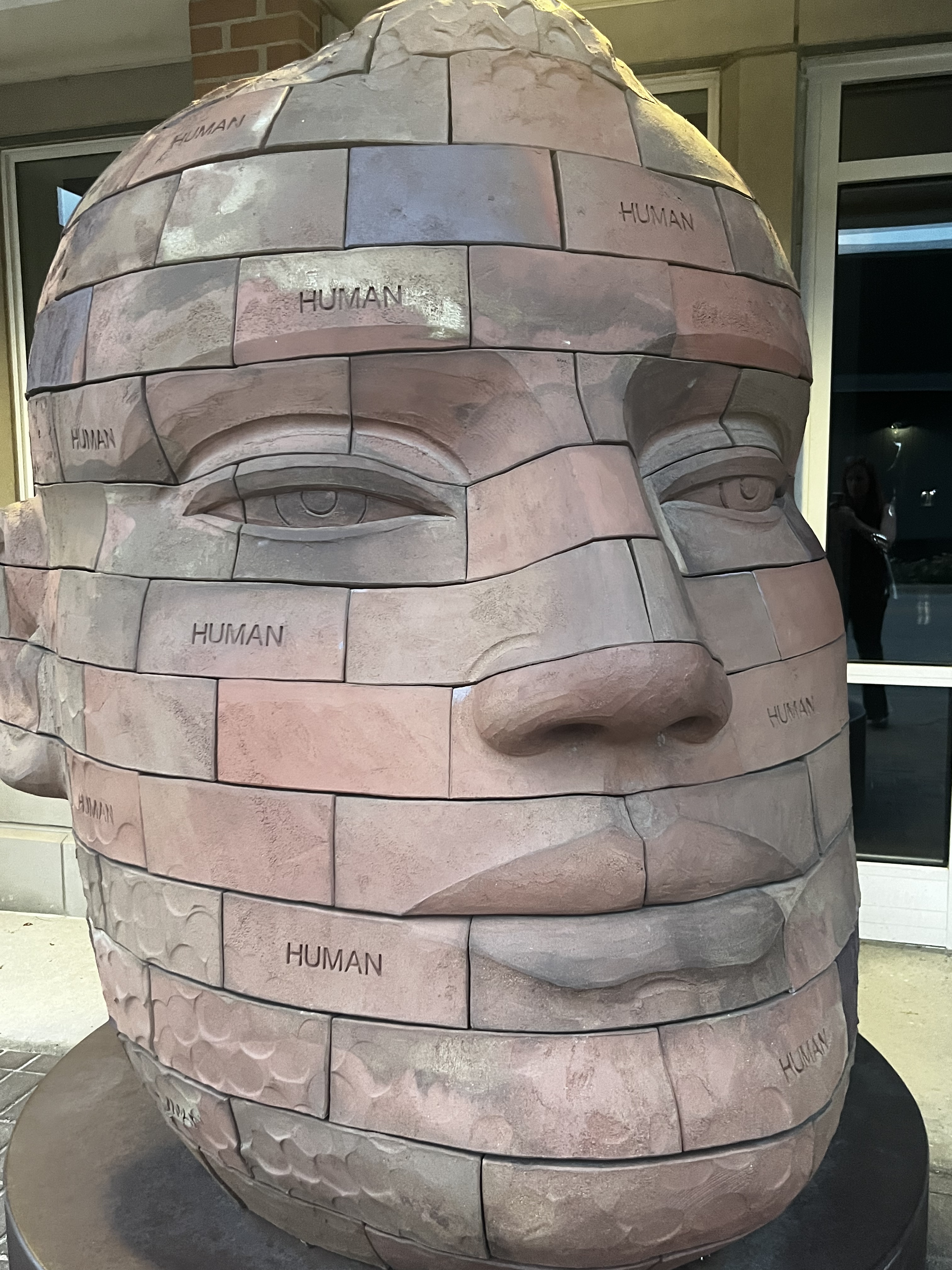 When you look more closely you notice the bronze-tinted skin tone, you register the fact that no toddler is that self-contained, and you decide that a facial expression is a little exaggerated or slightly “off.” But, wow! The realism takes you off guard and the unconventional placement of an artistic sculpture — in your way, quite frankly — causes you to pause. And that’s a good thing!