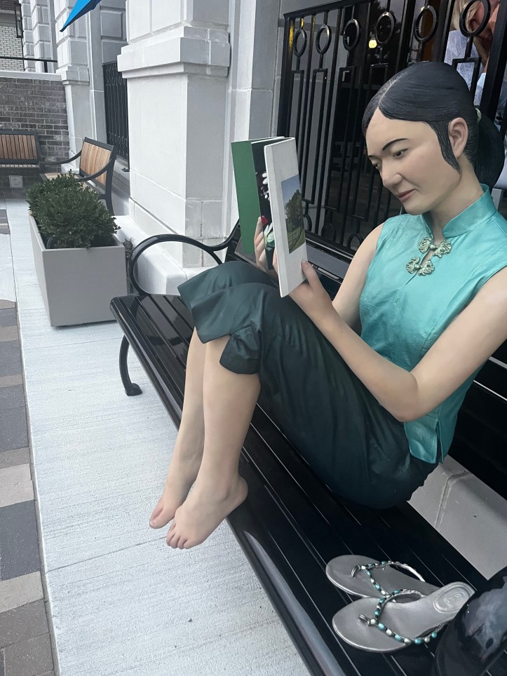 One of the most intriguing, and sometimes alarming, things you’ll see driving around the arts district is the odd characters you’ll catch unexpectedly out of the corner of your eye. They are doing ordinary things – reading books, riding bikes, holding hands, and carrying groceries – while eerily frozen in time. Realistic life-sized sculptures, cast in bronze and doing all the ordinary things we occupy our days with, are scattered along the art district’s brick sidewalks.