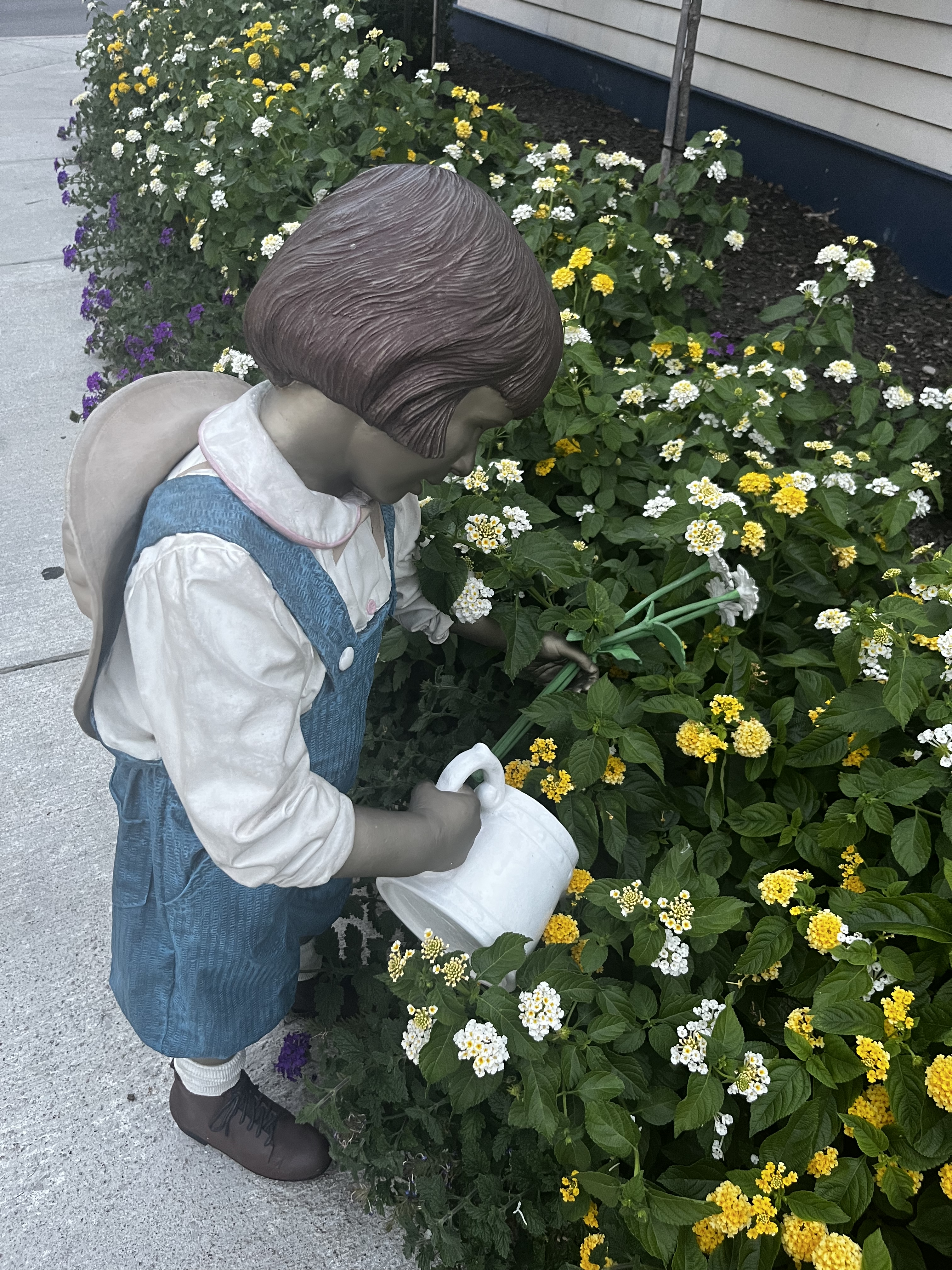 Down the road, the doors of the World’s Smallest Children’s Art Gallery were locked when I was visiting, but I was able to enjoy the gardens, the burbling fountain, and the surprise of discovering another of Johnson’s statues, just a few feet tall, with a watering can in hand. She was doing a fine job — the flowers were thriving under her care. I’ll need to visit on a Friday, Saturday, or Sunday next time, to gain entrance!