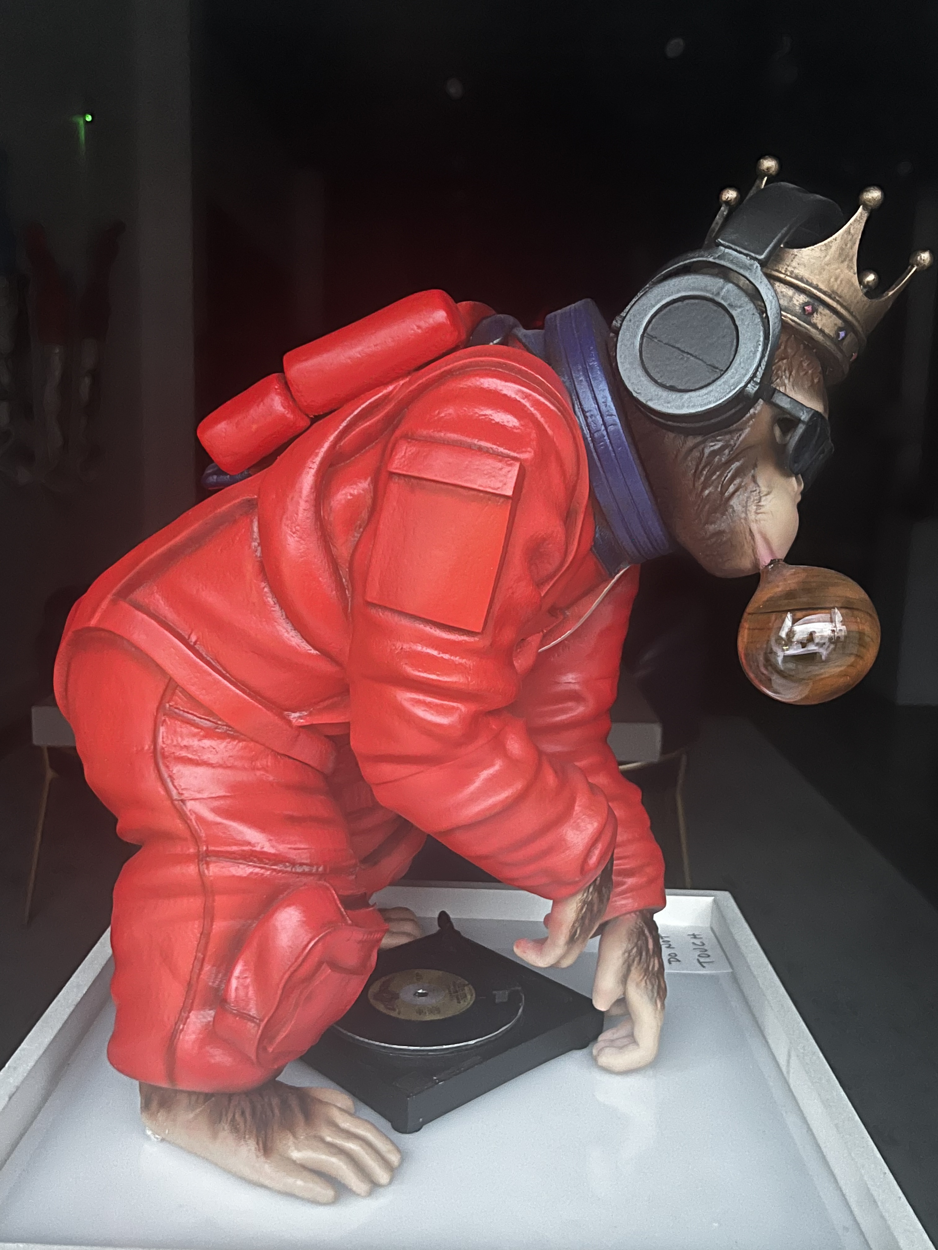 Who doesn’t enjoy discovering a chimpanzee in a red spacesuit, wearing a gold crown and oversized headphones, while he spins a turntable (or is that a CD?) and blows a Bubblicious bubble?