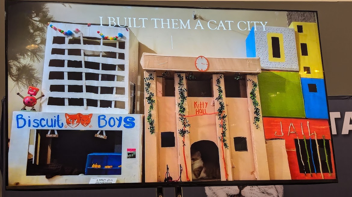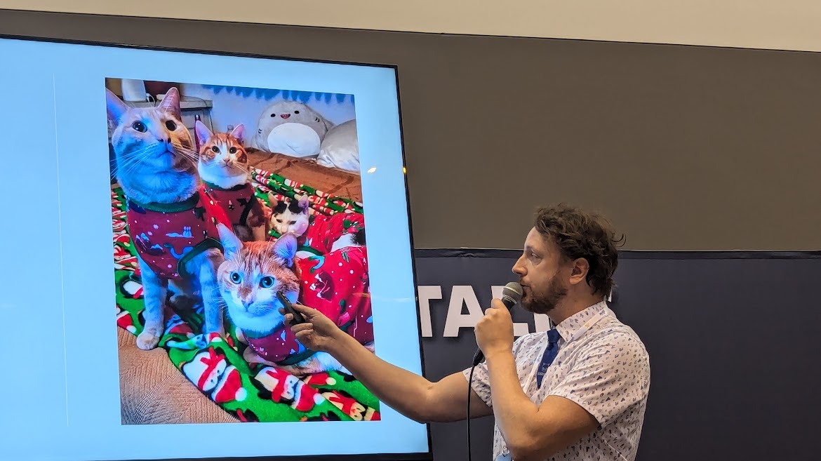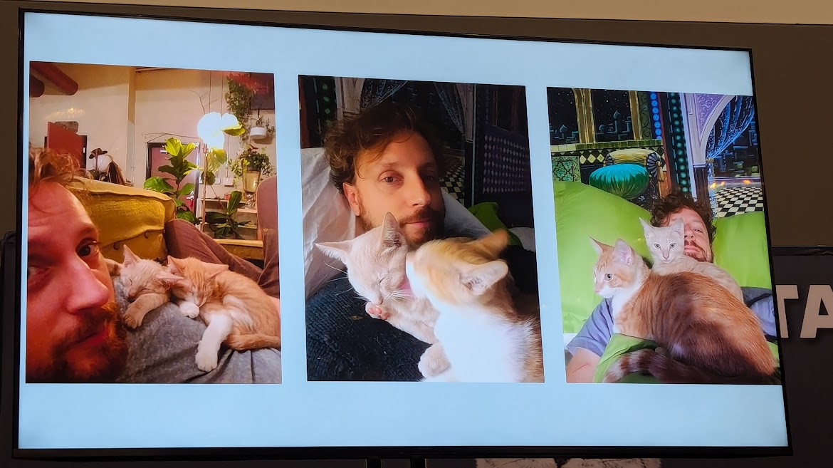 Questions filled the hour, moderated a pair who run an in-home cat sanctuary “19 Cats and Counting.” Questions ranged from “How do you make the cats talk so much, in your videos?” to “Can you tell us about your first cat or a cat that really touched your life?” to “I don’t know how to spell “Doug”…?” With a chuckle, Drennon kindly informed the 6-year-old that his emo tuxedo cat’s name is spelled “D-O-U-G”.