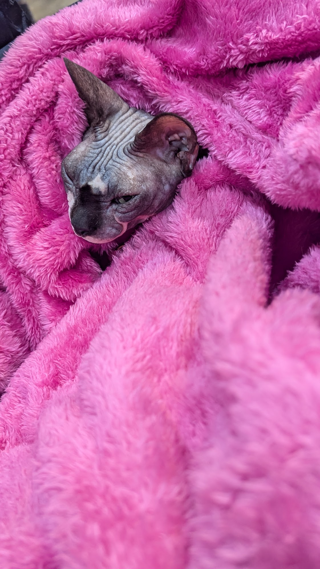 Some of the cats were just naked, for all the world to see. Others of the hairless breed were clad in hand-knitted sweaters. The most doted upon Sphynx cats were snuggled up in plush blankets and had personal heaters close by, to keep them toasty warm. The cat show is the venue for the wedding of Nudacris and Farrah Pawcett, who have made the cat rescue Allycats and Aristocats the beneficiaries of their registry.