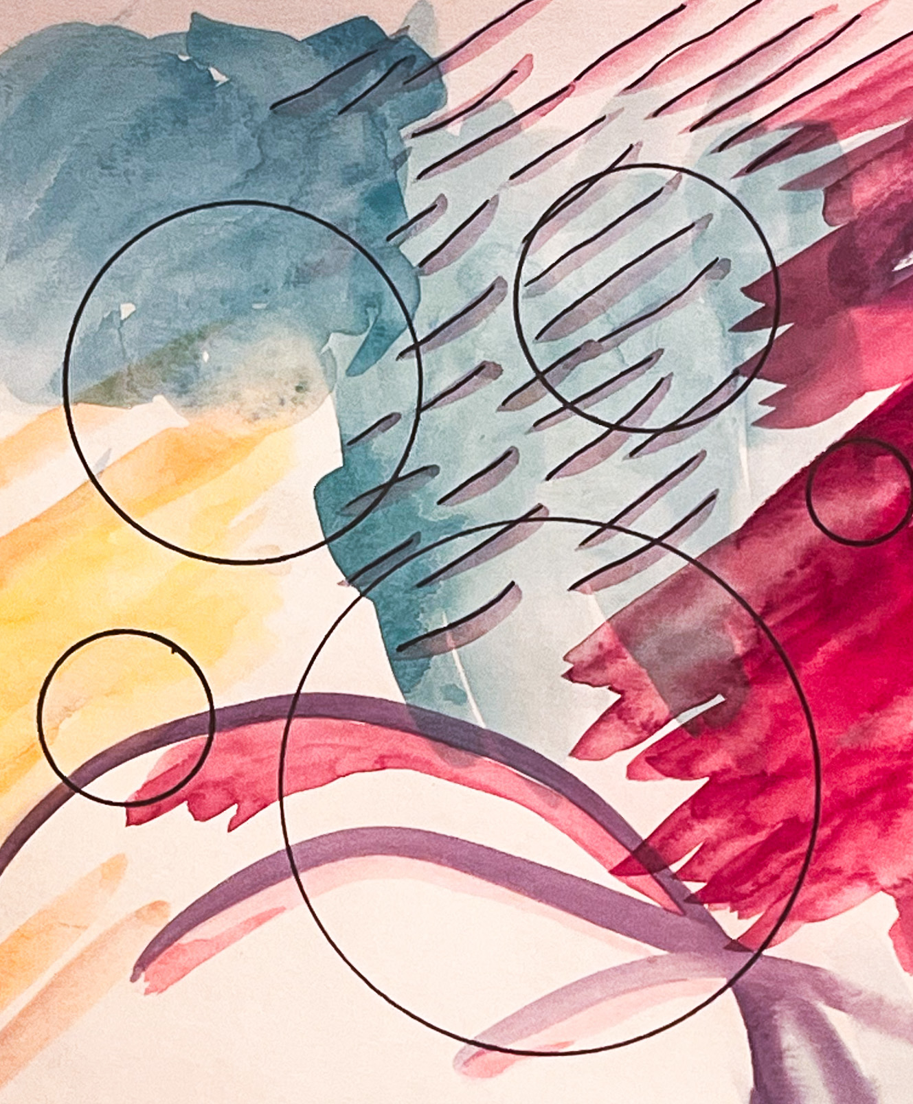 Artists are encouraged to sync their breathing to the motion of their pen, brush, or marker. Just see what happens. What comes up, in the mind? What comes out, on the paper. My interpretation is to breathe in. . . calm creativity; breathe out. . . art that’s uniquely me.