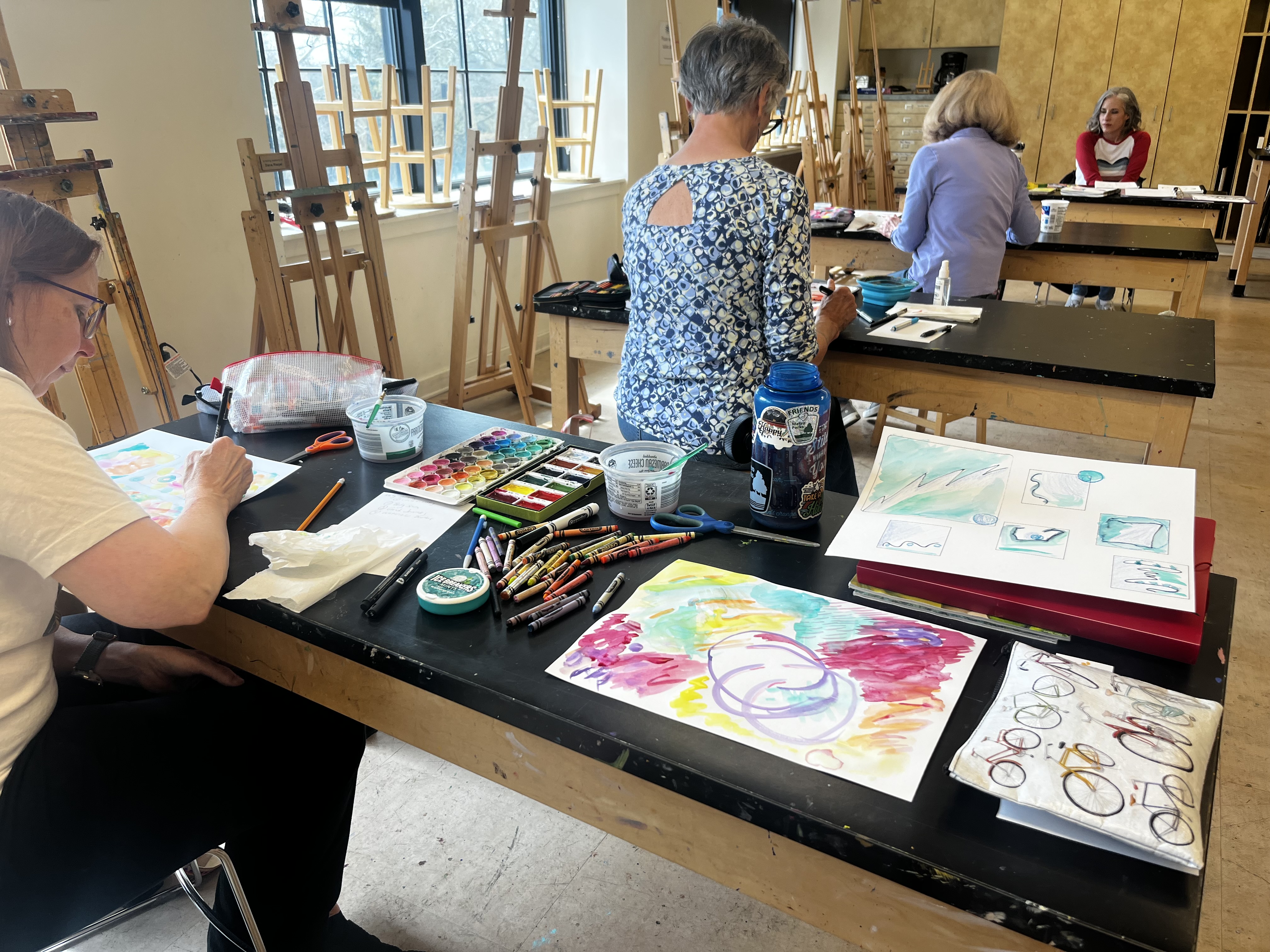 Just about anything is welcomed as inspiration — a feeling, memory, or vision, images, sounds, and impressions. Artists can bring their own tools and supplies, but also lean on the instructor and other students for supplemental resources. We move quickly from one mindful prompt to another reflective exercise. Journaling and self-exploration are components of the workshop. Much is accomplished during class, but continued experimentation is encouraged.