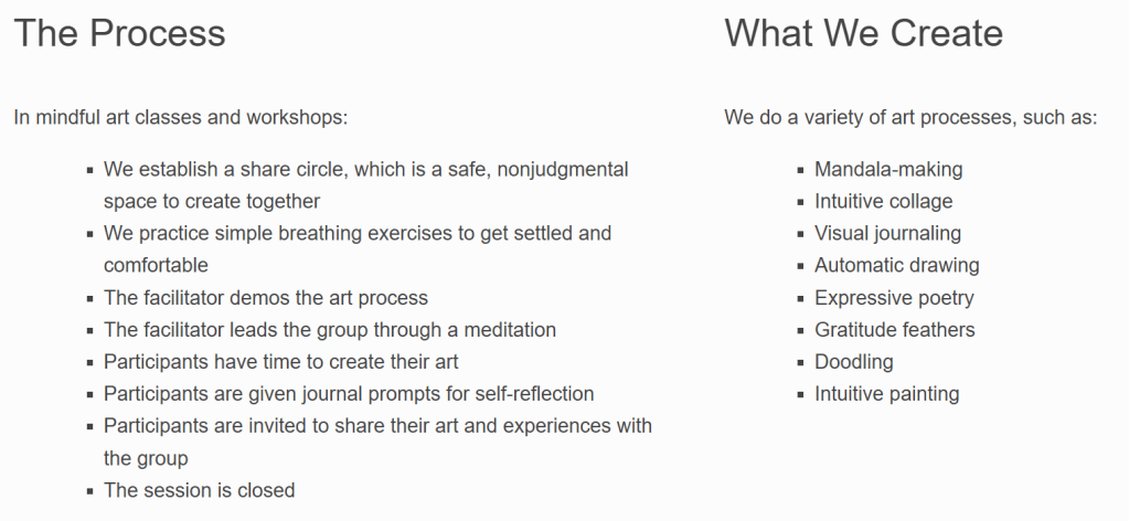 Through art experiences for adults, mindfulness is encouraged. “Our classes and workshops are an opportunity to explore and express your authentic self through art.” (Living by the Brush website)