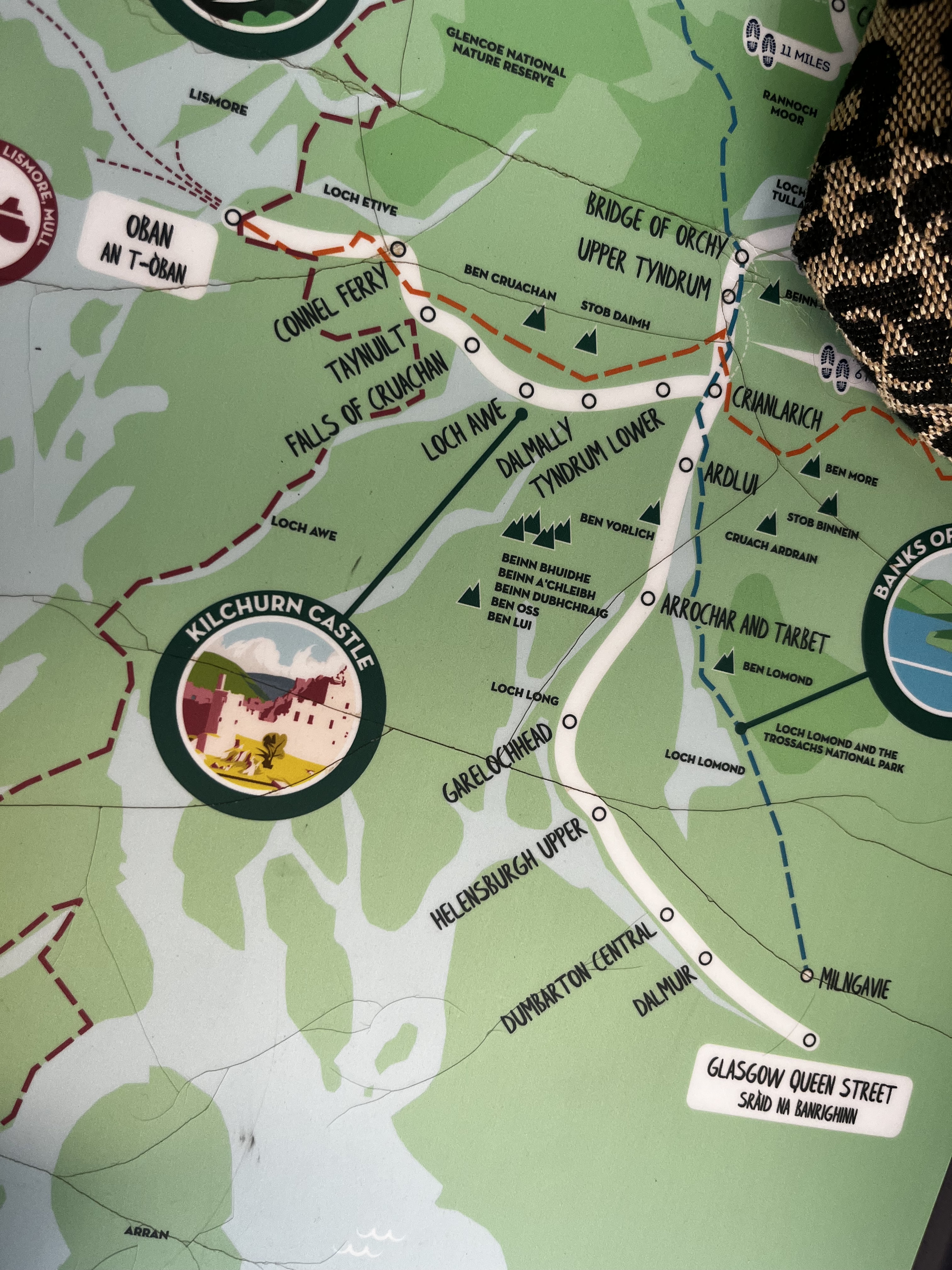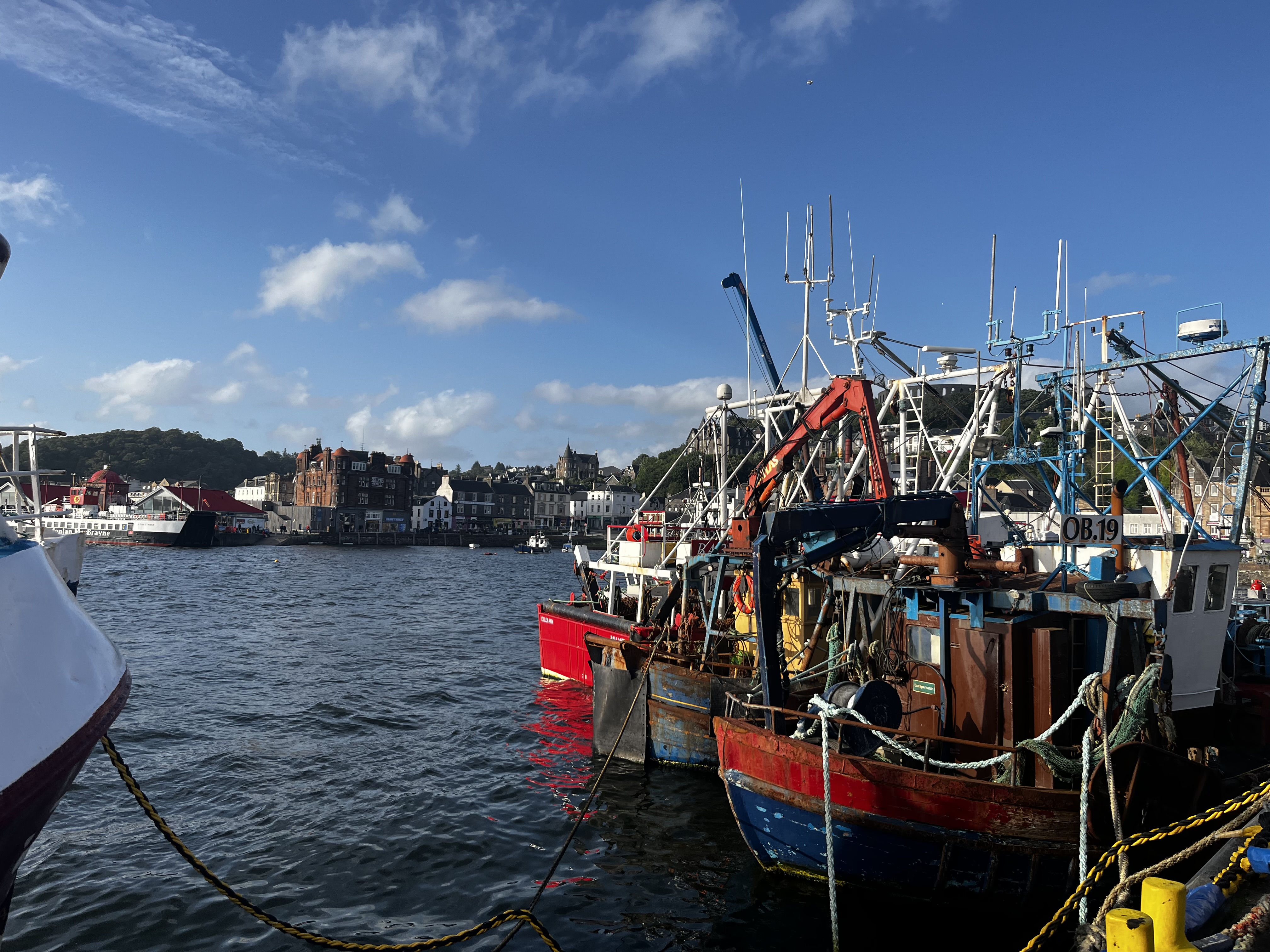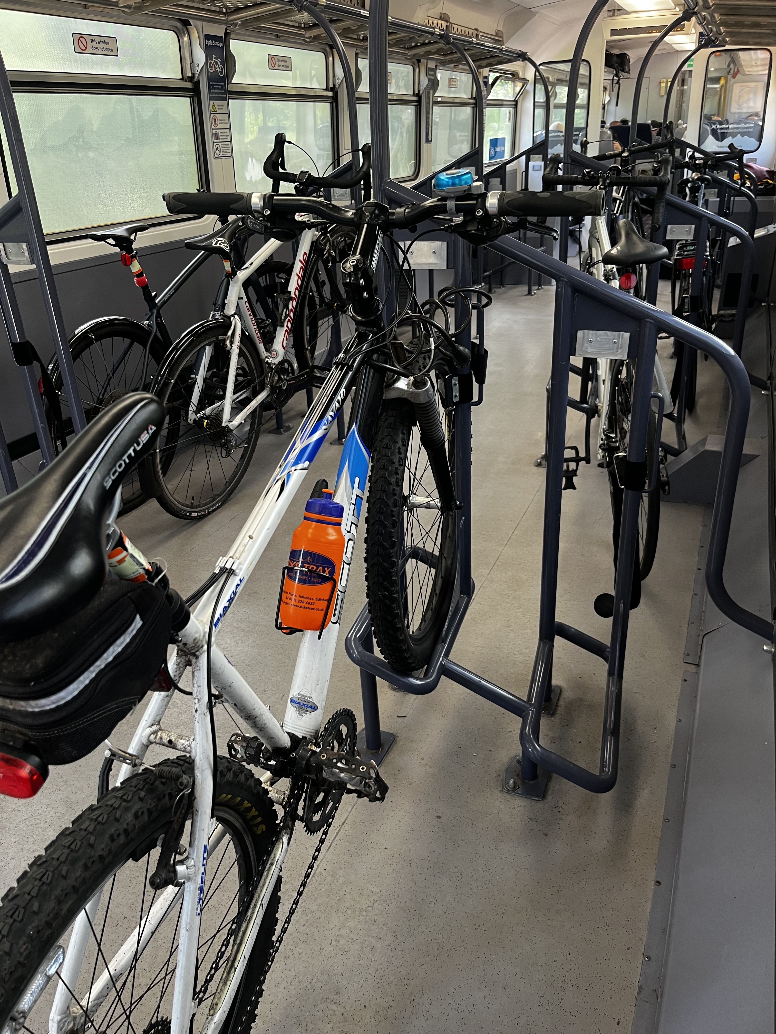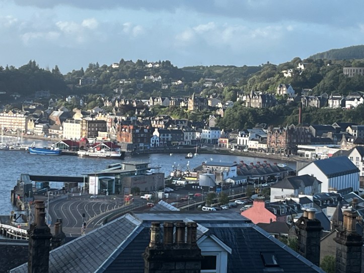 There are nine cyclists in our party. Eight of us made it to Glasgow train station at around the same time, then took the train to Oban. We were in the same train car, with open seating, but got to sit with a variety of different characters, who openly and enthusiastically shared their stories. Our seat mate had a little bit of brandy mixed in with her chocolate flavored drink. “No one knows what I’m doing!” she said. Until she tells the whole train car. She’s a widowed single mum, with kids and grandkids scattered around the area, and takes that same train several times a year to see the family. “I think they miss me even more than I miss them when I’m away.”