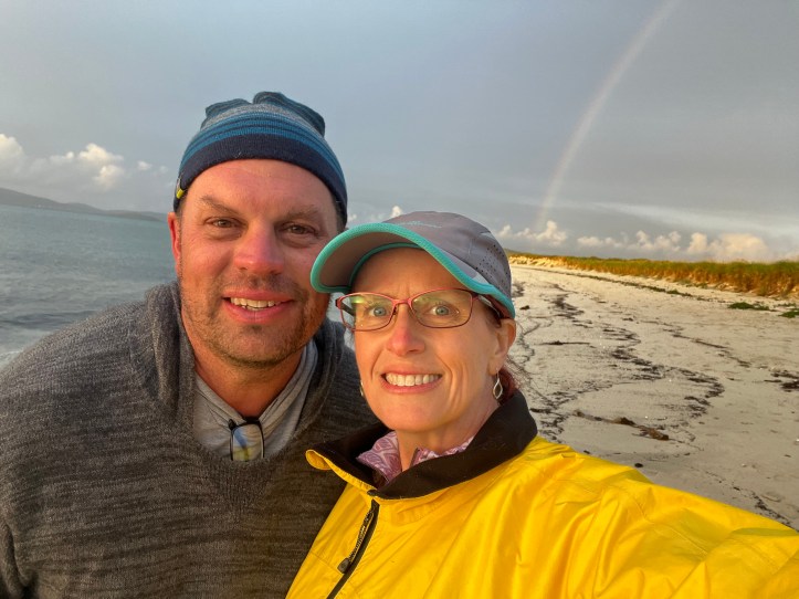 This delightful. scenic day ended in “wild camping” on the beach, which is permitted in Scotland. It would be our last day of camping, so I was determined to pitch our tent, despite the chance of rain. It wouldn’t be the first time on this trip that we’d set up camp in the rain. We’d hauled all that camping equipment across the Outer Hebrides, after all, so in my heart I wanted to camp as much as possible. When I saw where we could set up camp, and the amazing view of the beach, I had no hesitation.
