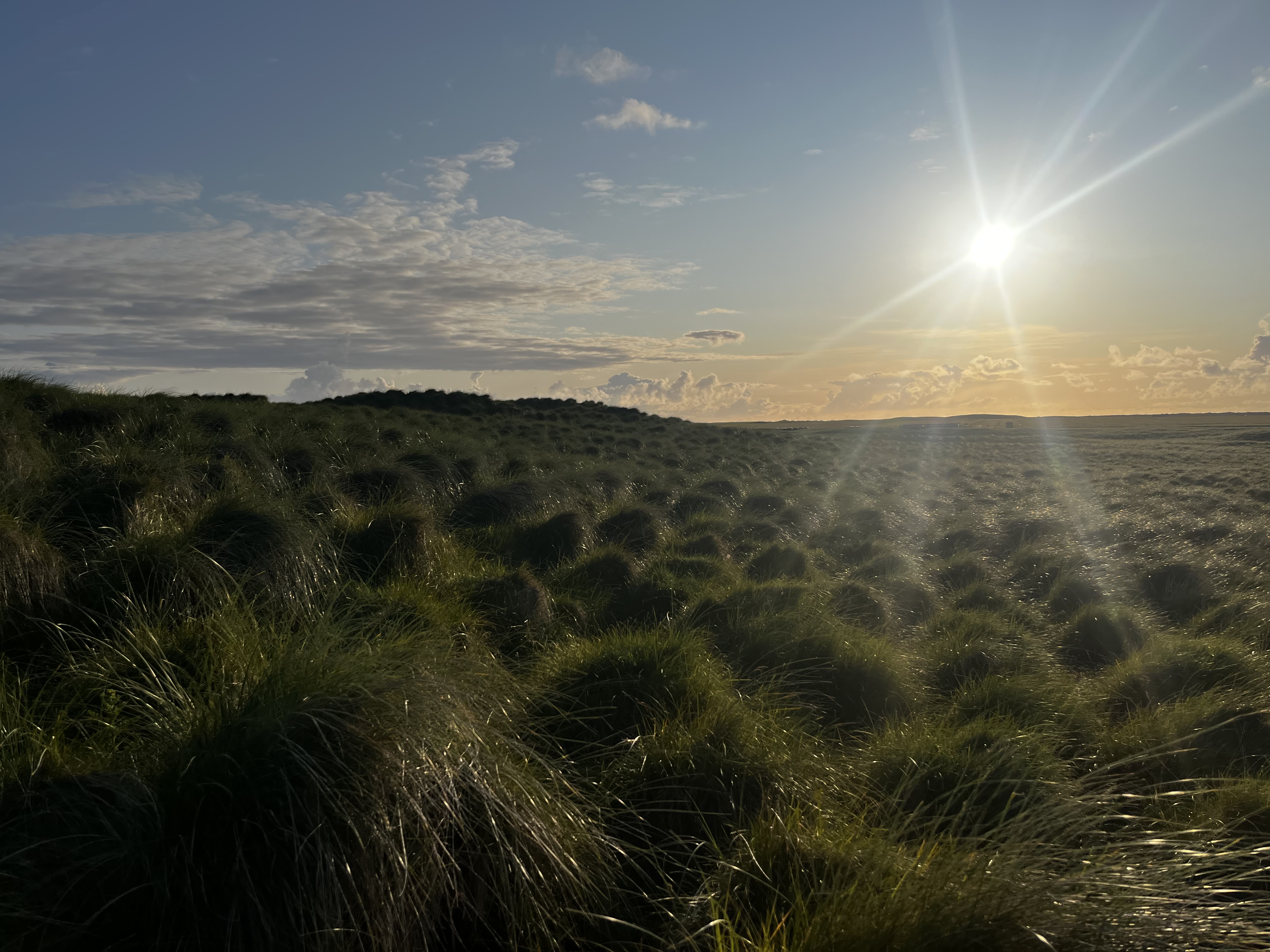 The ‘alternate’ route back to our campsite was along the water. We walked on the beach and then up and over sand dunes blanketed with bushy tufts of tall grasses. It was romantic, walking hand-in-hand down the beach, in no hurry at all. The sunset was (again) beautiful and peaceful. Oyster catchers, long-beaked birds that prance along the edge of the water, were about. We picked just the right spot to make a sharp right turn toward the dunes. We climbed. Our campsite was just on the other side.