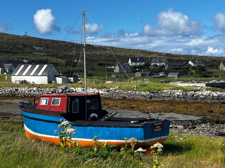 There was a climb to get our ride started, coming away from the ferry. Did I mention that this is common? We rode a mile, at the most, before stopping at the Harris Community Shop, where we found everything from groceries to screwdrivers, school supplies to local art pieces, and – of course – Harris Tweed. I wasn’t in need of a handbag, backpack, change purse, or luggage tag but I thought it would be fun to buy Harris Tweed in Harris. So, I found a small art print with a matte made of tweed cloth. It will be a nod to our trip, hanging in our home.