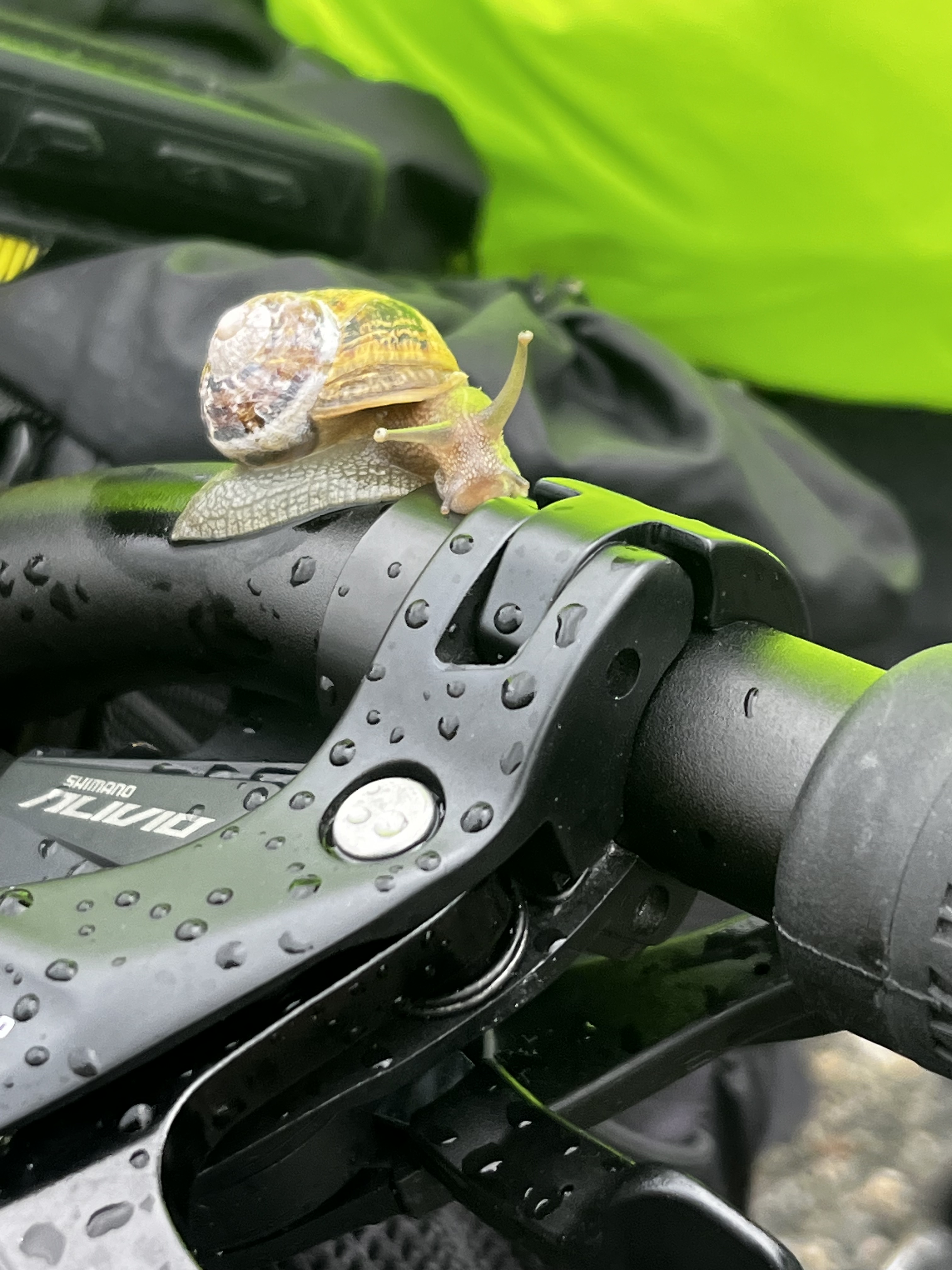 Along the way, we discovered we had a hitchhiker. The snail may have crawled up onto the bike overnight, before we awoke and headed out on the ferry, and was sheltered by the handlebar bag, but there he was. As we paused at an overlook, at the top of one of the many hills, he strutted out onto the handlebars to have a look himself. We dropped him off, a bit far from home – roughly 20 miles. About half that as the seagull flies, so perhaps he could hitch another ride home.