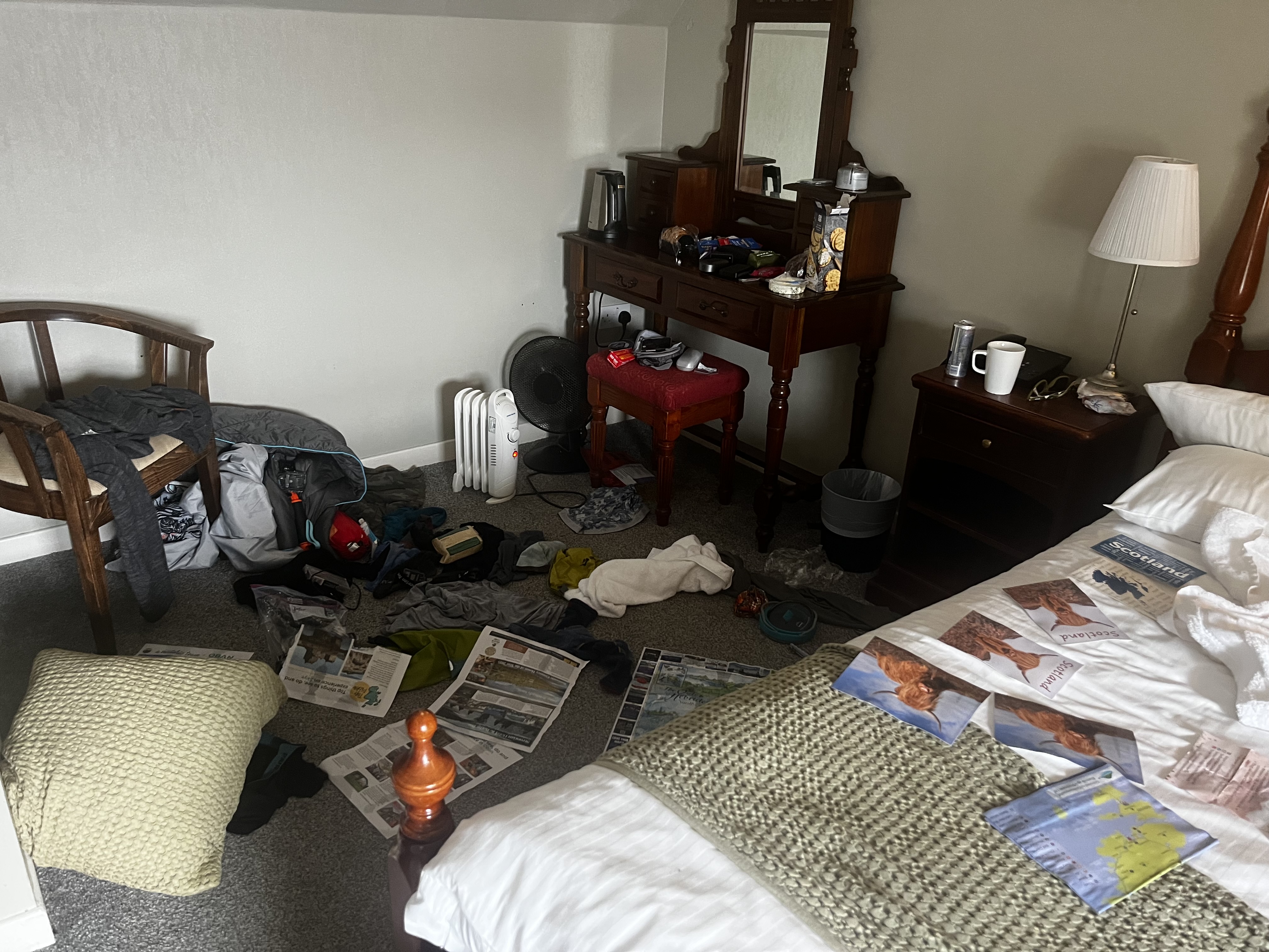 Within minutes of our arrival the contents of our panniers were emptied and strewn across the floor, the bed, tables, windowsill, and bathroom. I wasn’t convinced things would dry, but I had to give it a try. That afternoon I took a long, hot bath and was relieved that we were not camping in Portree that night. If that had been the plan we just might have bailed and booked a room.