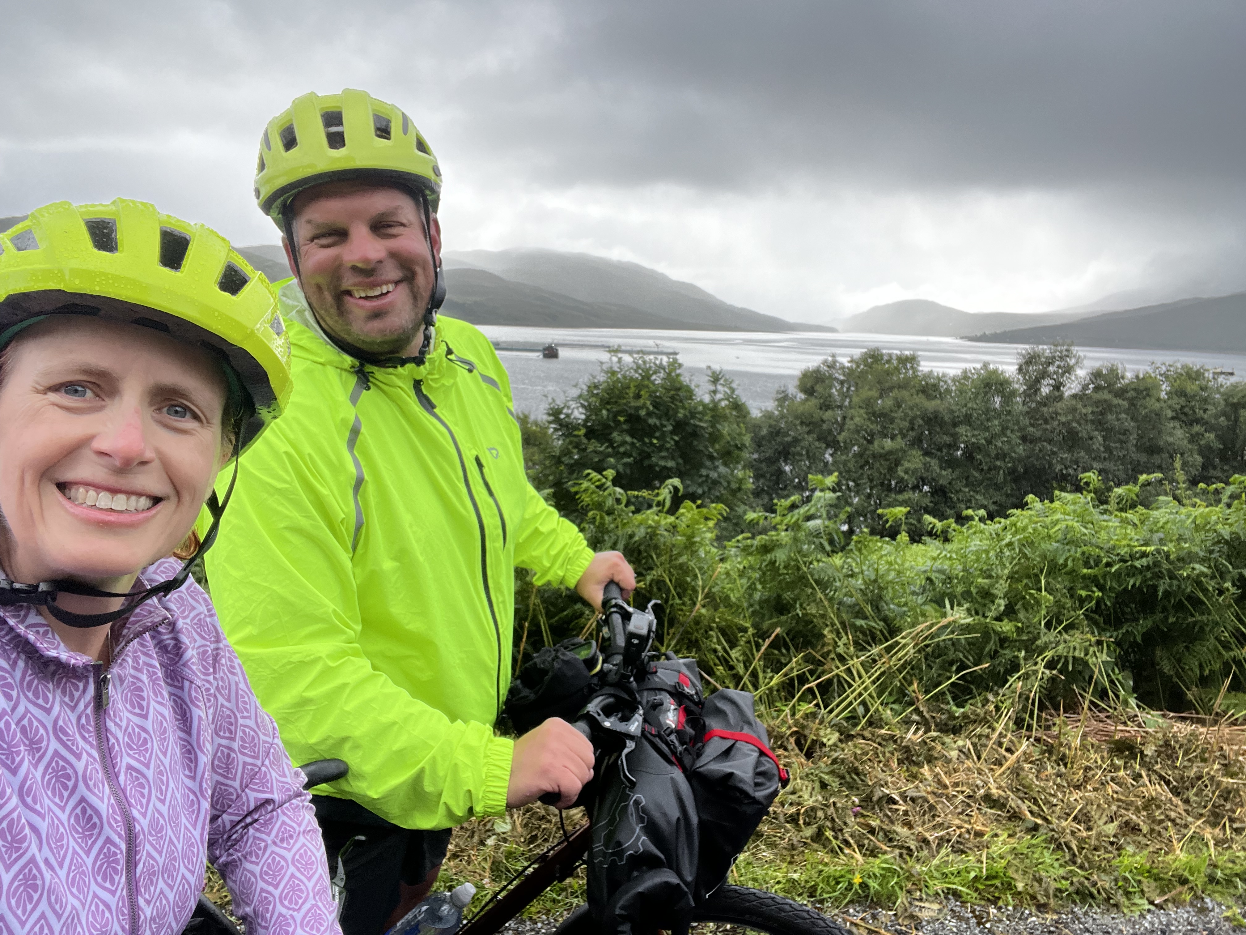 Our friends weren’t planning to ride the final segment of our route, but they showed up to see us off on day 6 of our Scottish adventure. They shared spare bike lights, extra snacks, and their enthusiastic encouragement. It was a dark, overcast morning and we had another long, steady climb to start the day. We’d see 7 or 8 miles of a consistent incline under a heavy sprinkle, with just the two of us riding.