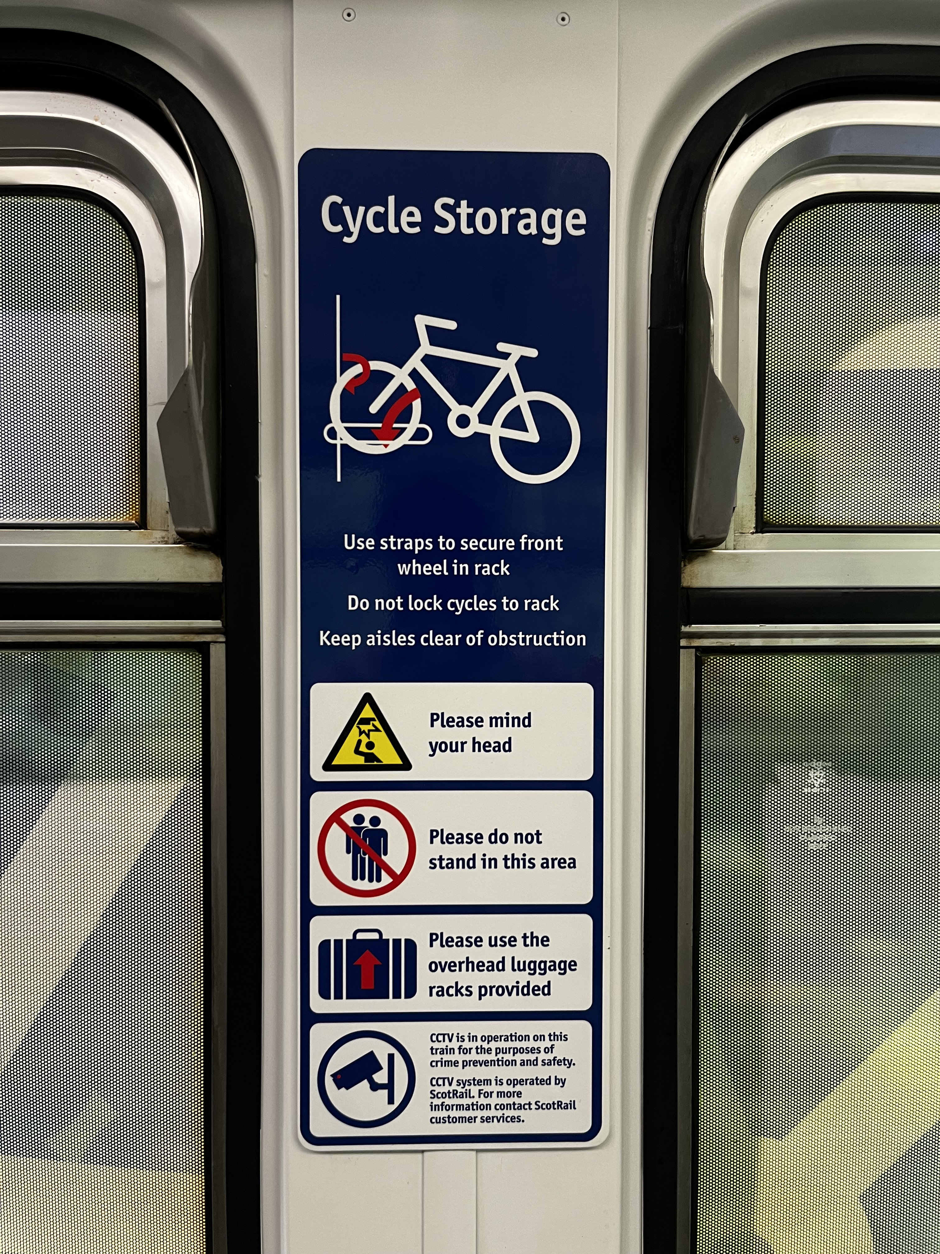 Once we landed in Edinburgh is was a precarious walk to Glasgow Queen Street Station, because we were loaded down with our carryon bags, suitcases, and backpacks. We didn’t have our bikes yet, thank goodness. While it would have been easier to put 1/2 of our gear onto the bikes if we had panniers (which we did not yet have) I don’t know how I would have juggled a bike and a large suitcase.