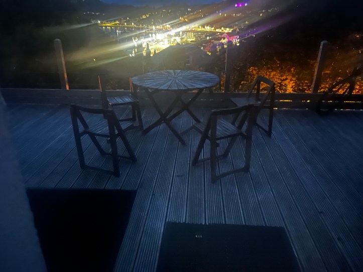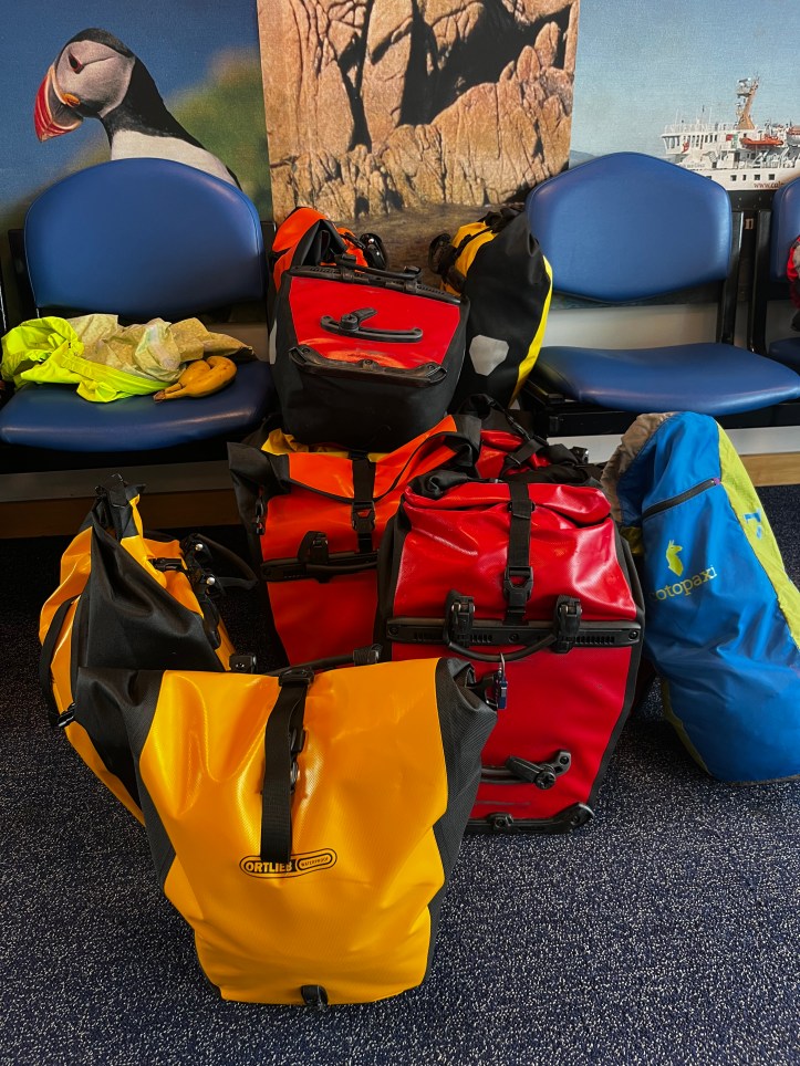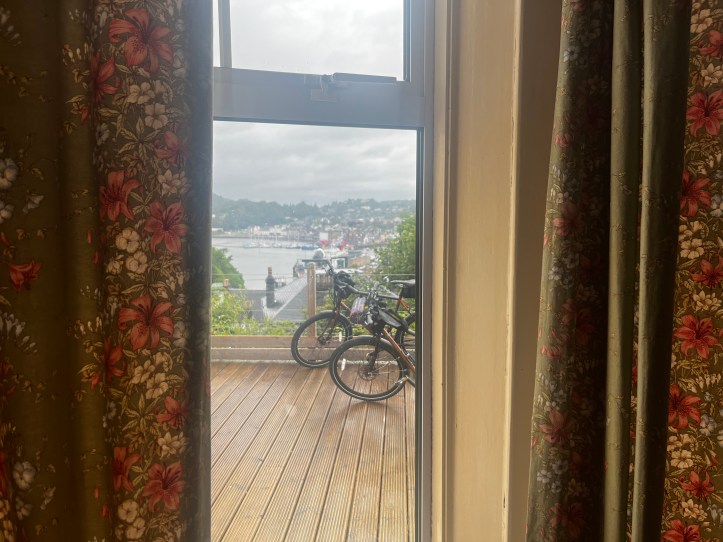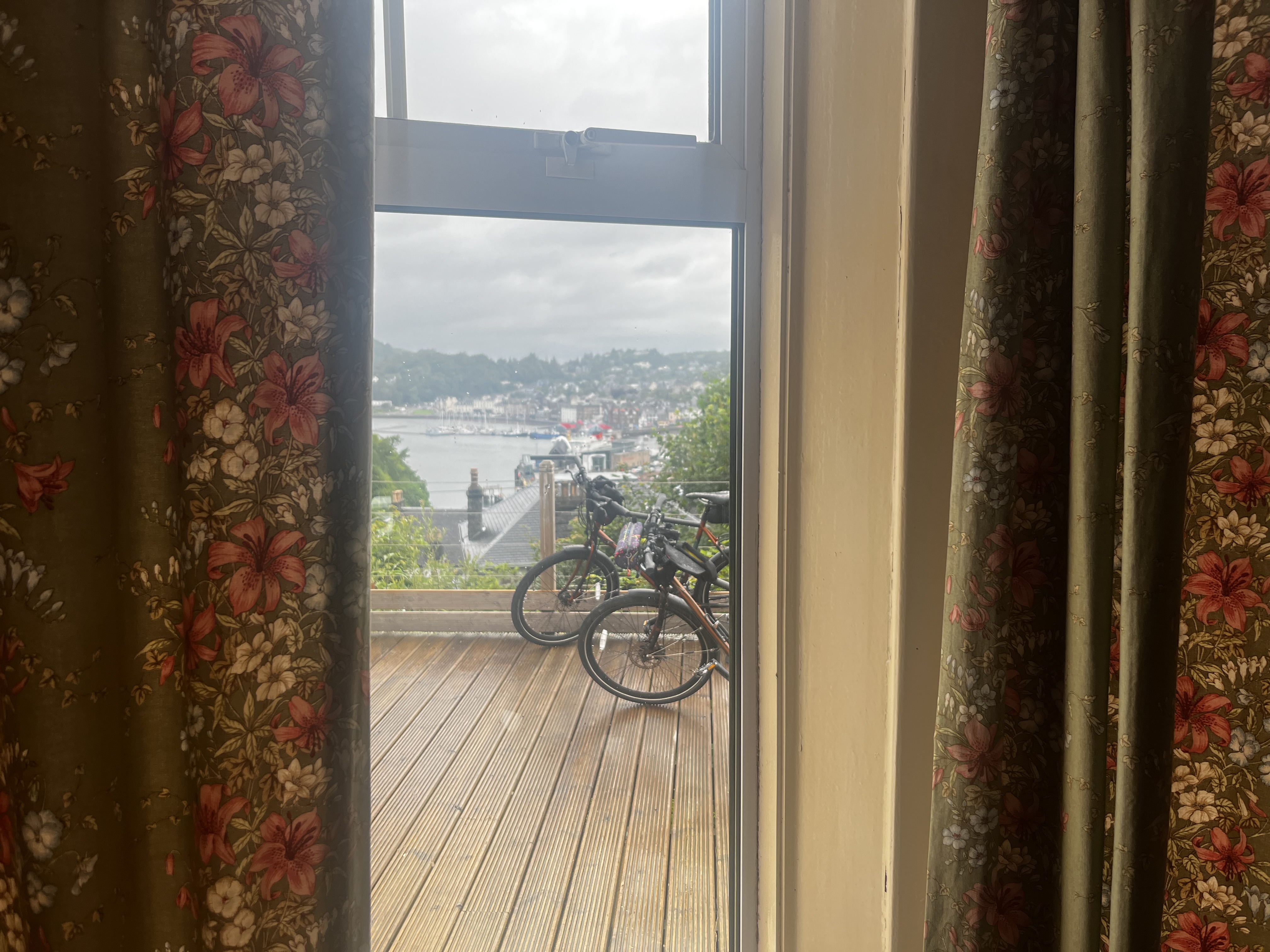 In Oban we shared an AirBnB with another couple. It was a 2-bedroom villa-like home, with an eating area that opened onto a balcony that overlooked the harbor, from high above. After getting up the hill we’d earned the view. It was so high above town that we strategically planned how many times we’d need to walk up the hill to the lodging. The first trip up to the AirBnB was with all our personal belongings. On arrival, we all spread out on the front balcony to divide out what we’d need for our cycling adventure and what we could leave behind with our luggage.
