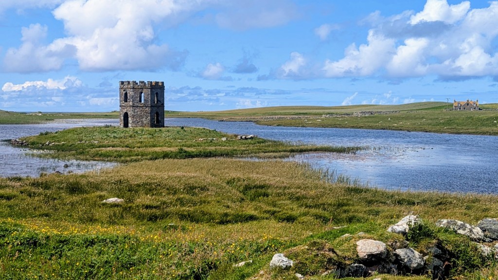 “Built on the site of the Iron-Age Dun Scolpaig and surrounded by a low stone wall, the now-roofless structure features a string course between its two storeys, a window in each of the eight faces of the upper storey and a crenellated parapet. It was B-listed in 1971 and can be reached by a stone causeway when the level of the loch is sufficiently low.” (Scottish Places)