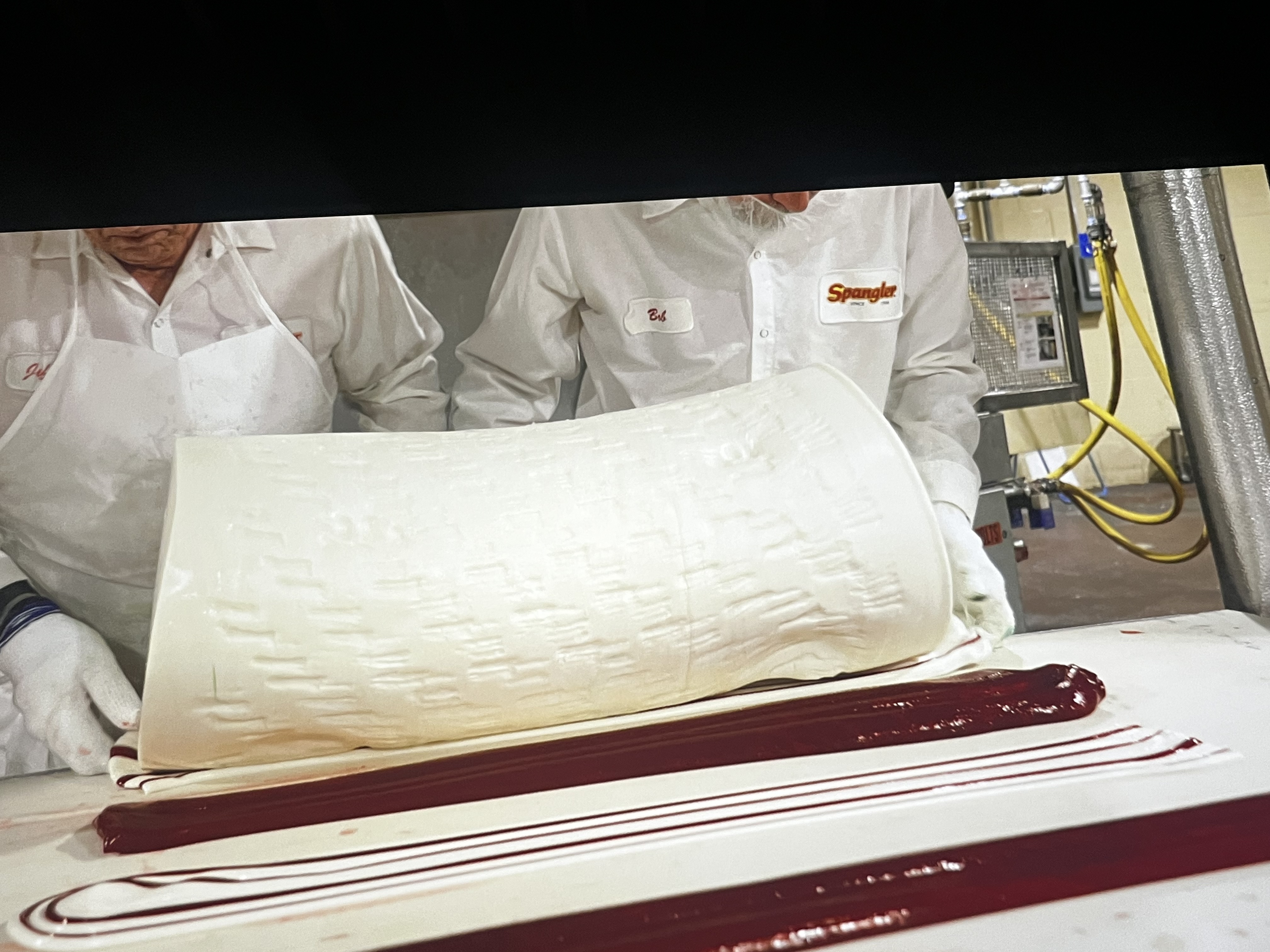 I’d be remiss if I failed to mention the manufacture, production, and distribution of candy canes at Spangler. What a fascinating process to watch, the making of a candy cane – from pulling the candy base to spiraling in red and white stripes, from the mechanization of the production line (with a human touch) to the machine that creates the ‘hooked’ top of the cane. I can almost taste the peppermint!Memories of Christmas Eve come flooding back.