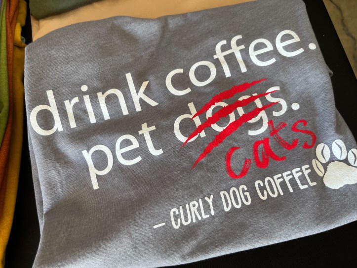 … but the cats won’t stand for us playing favorites – well, unless it’s in their favor! (In truth I’m an animal person and love them all! My childhood dream was to become a veterinarian, before I realized that words were more my strength than scientific practices.). Cats make their superiority known on Curly Dog Coffee attire, as you’ll see below – “drink coffee. pet cats.” Always!