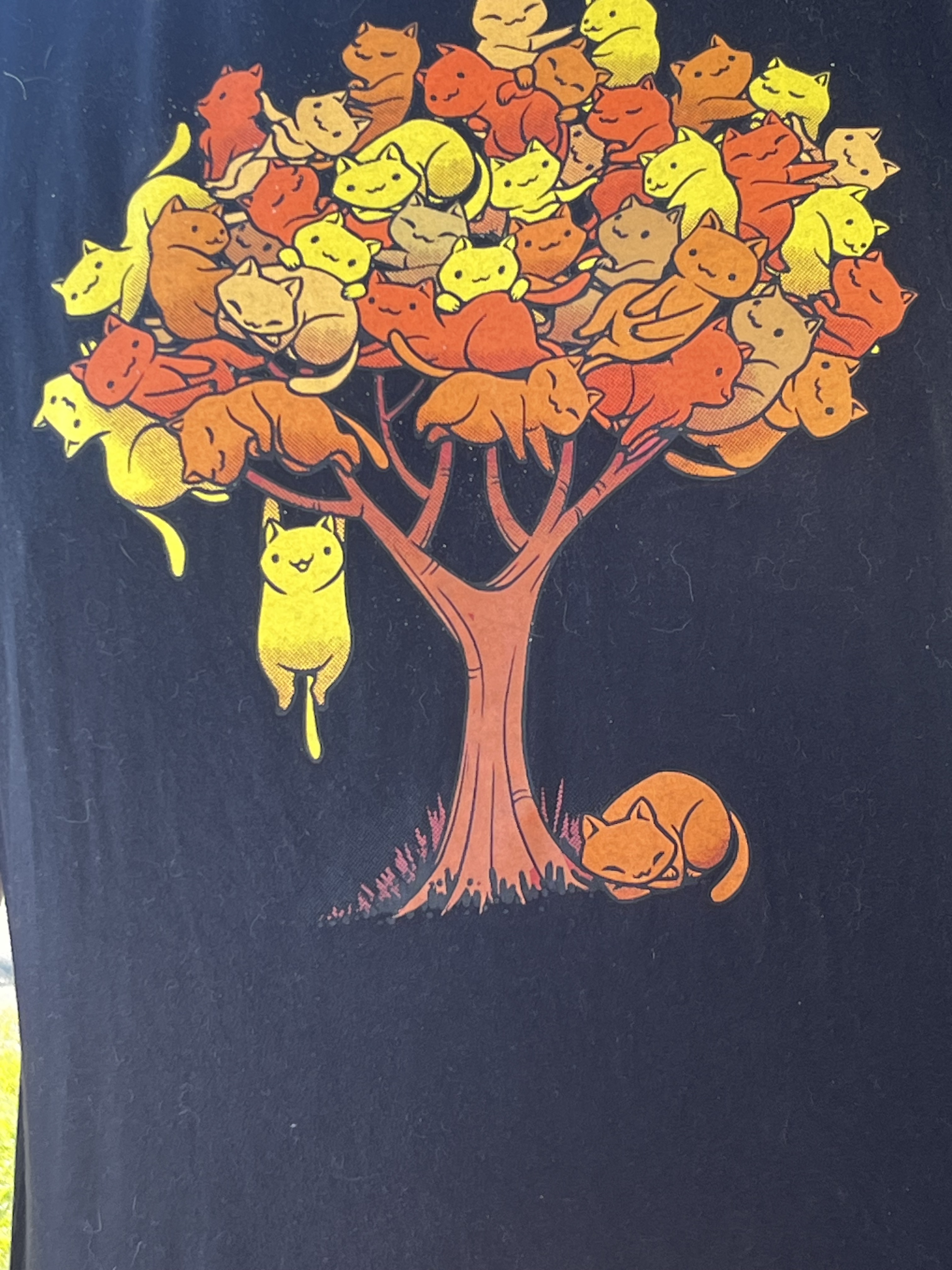 Matcha drinks are handed out, in exchange for social media recognition. Folks who like coffee and art must also be drawn to plants because a vendor offers simple cuttings for you to propagate, while others put in the front-end work of gardening, allowing you to walk away with a stable, mature plant. One coffee roaster is wearing a colorful t-shirt that turns a pile of cats into a fall tree. I ask permission to snag a photo.