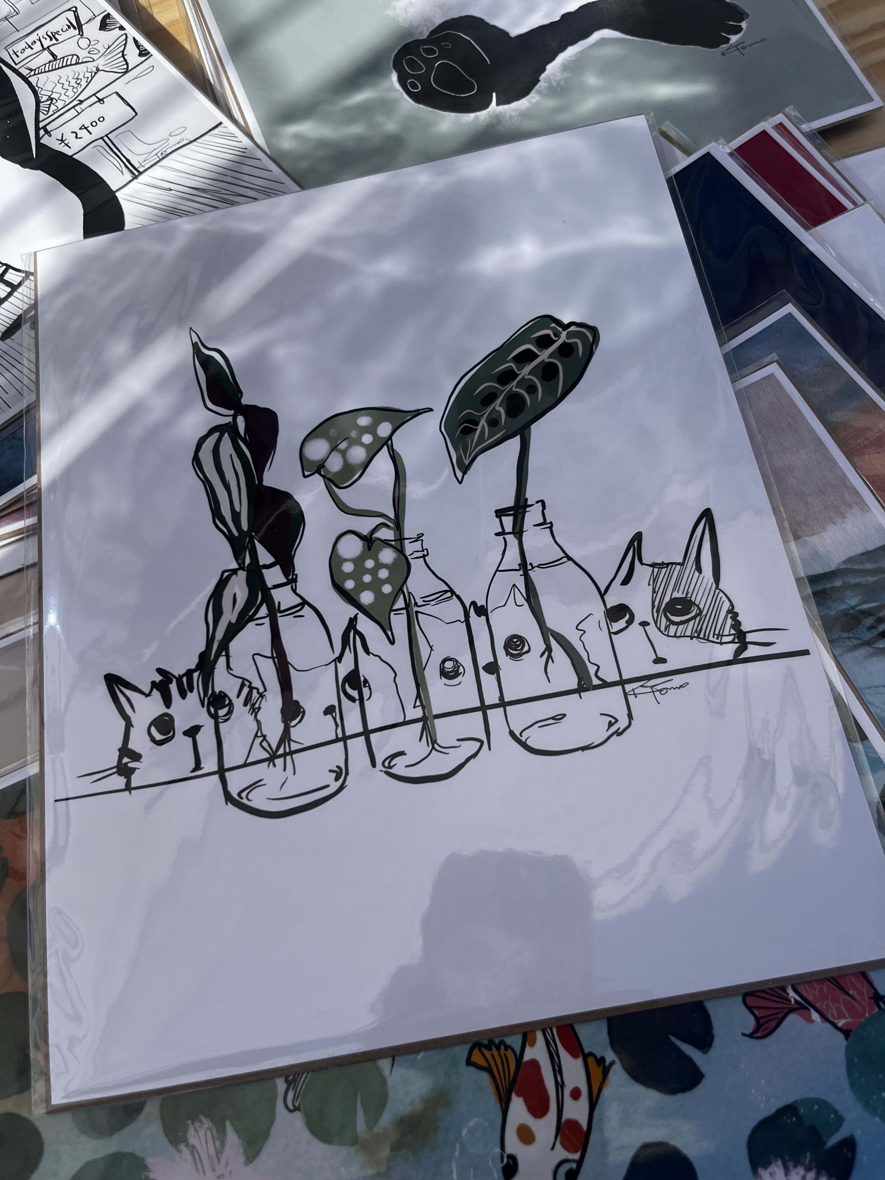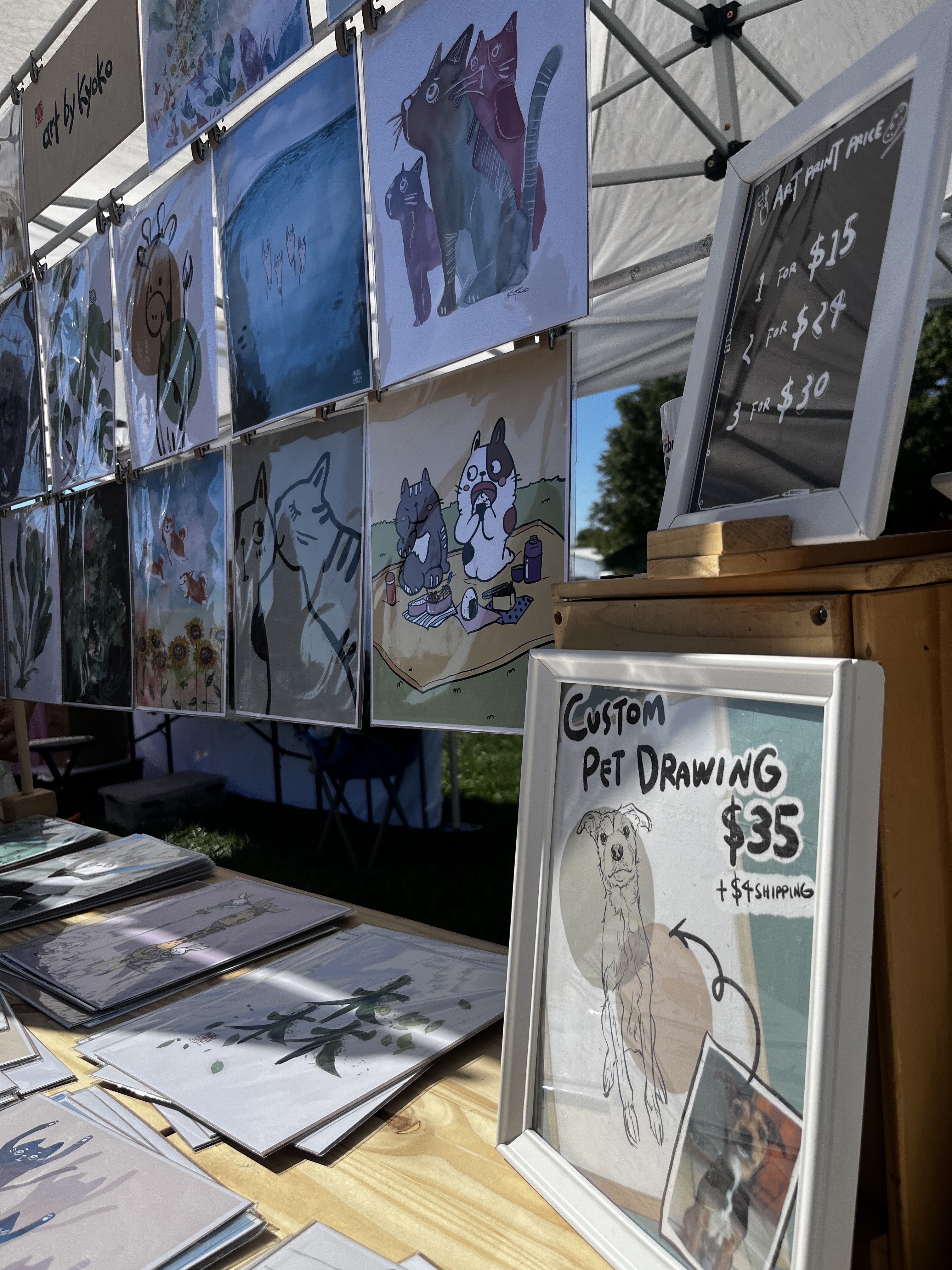 If you’re looking for a whimsical art experience, Art by Kyoko is one of the artists this year. Her work is inspired by themes of the outdoors, adventure, and wildlife. Houseplants and pets are featured too, bringing these themes into our everyday environments and day-to-day lives. Kyoko’s work is joyful and inquisitive – her subjects are too. She offers custom pet drawings. I may need to look into these, for my three fur babies.