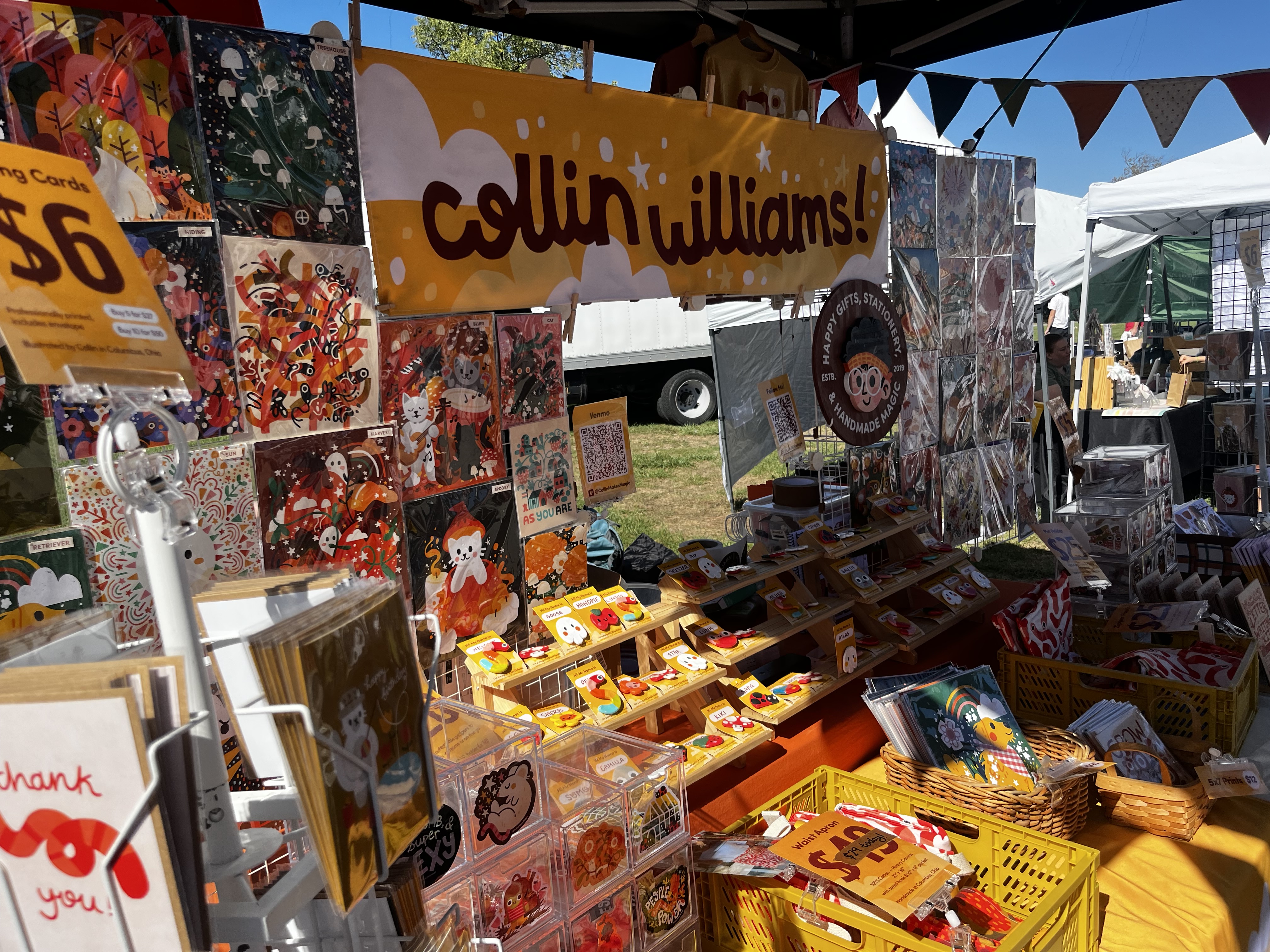 A few booths over, a young artist’s colorful palette brings levity to his art. Orange, yellow, and red converge into a warm autumn display for Collin Williams. I’m sold!