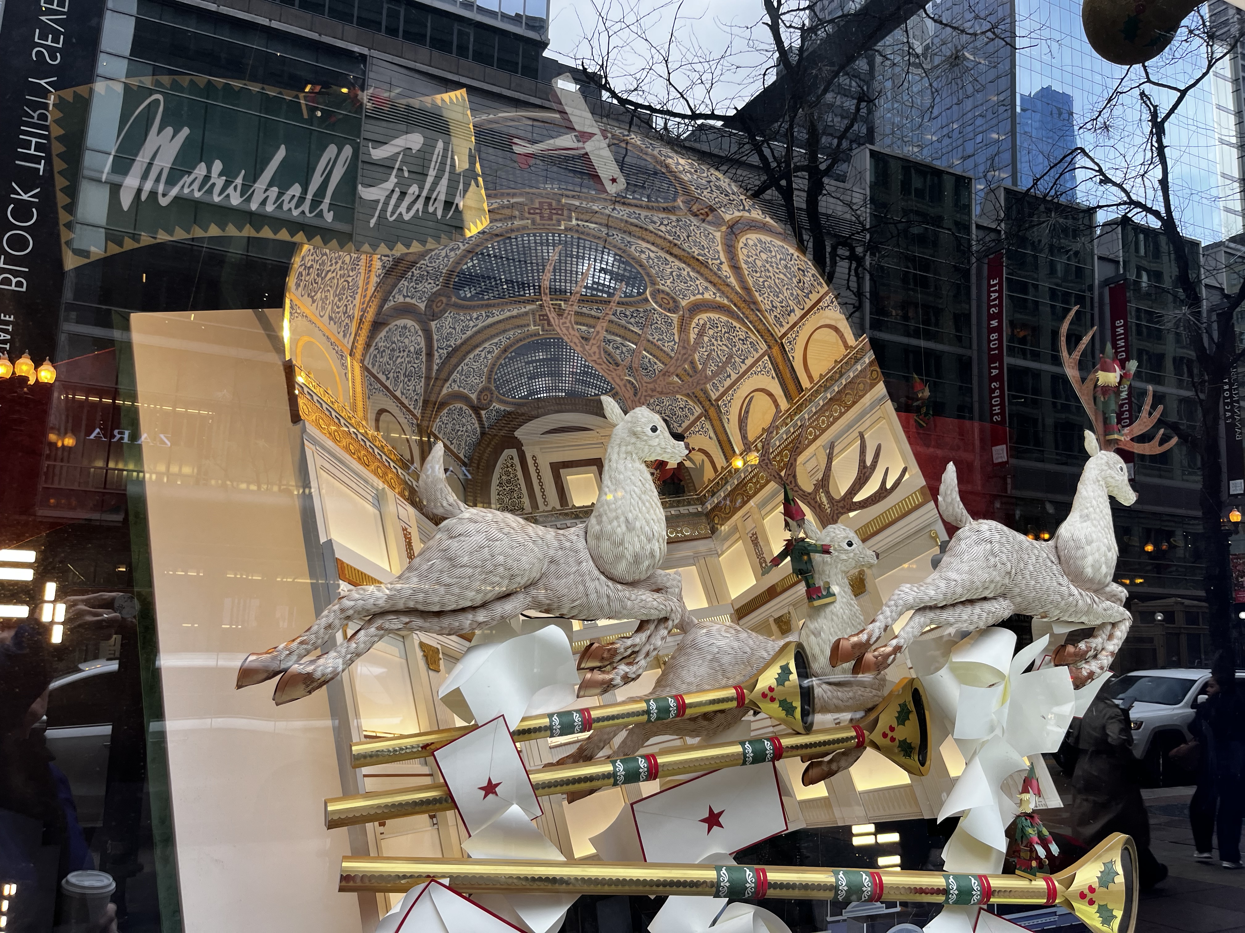There was still plenty of holiday cheer downtown, with brightly decorated Christmas trees in the lobby of just about every office building we passed. We knew that the tradition of elaborate, animated storefront windows, decorated in storybook fashion, was alive and well at Marshall Fields (now Macy’s) so that was our next stop. We were not disappointed.