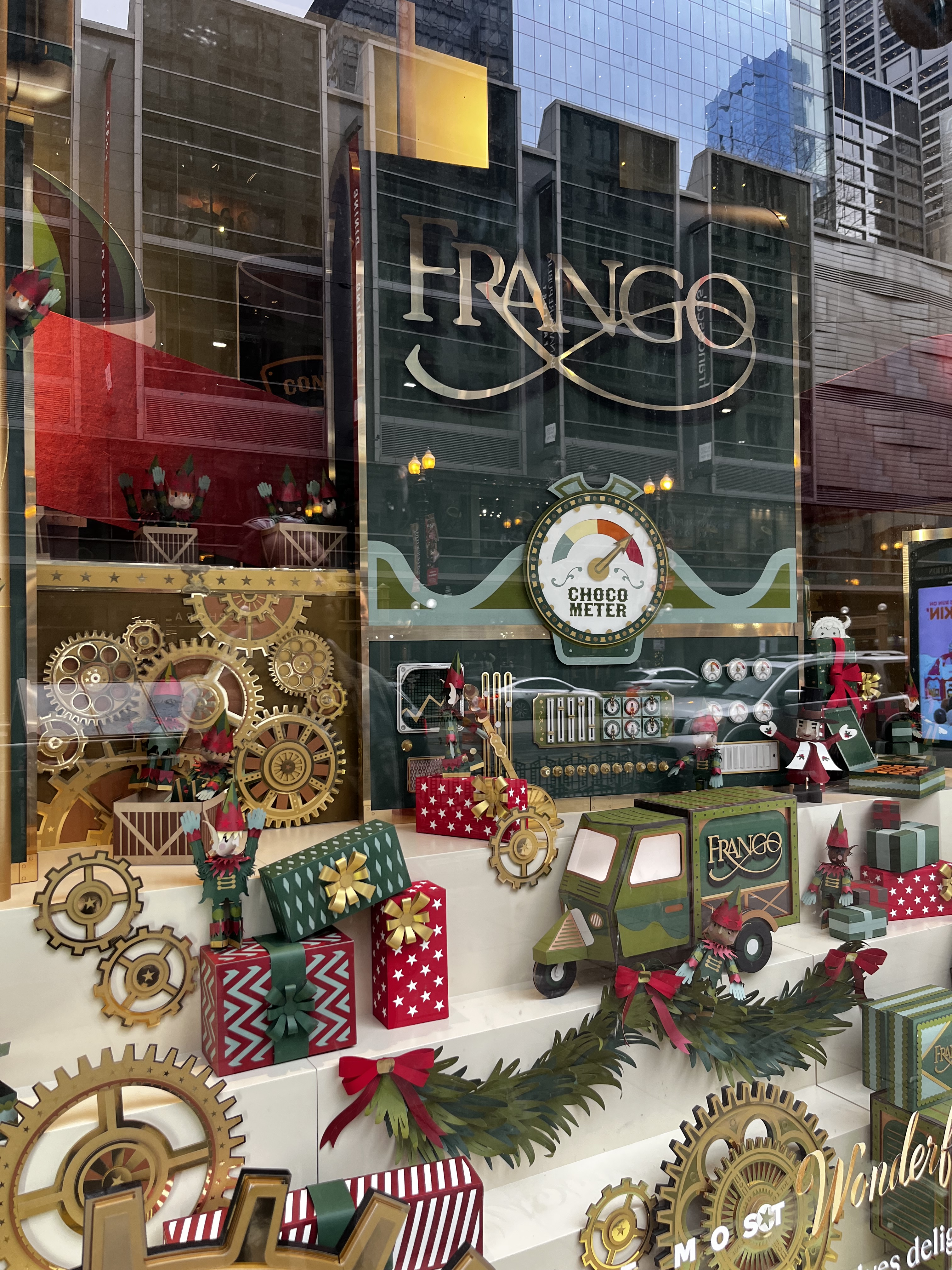 Perhaps my favorite part of visiting Marshall Field’s is the chocolaty Frango mints — cool, refreshing, minty, and chocolaty! The window display triggered the craving, so we headed inside. Sadly, the Frango area of the store, which Macy’s has retained, had been ravaged. All that was left were $28 boxes of dark chocolate or candy cane candies, which was not what I came for. I considered trying something new, but the distinct taste of the original Frango mints was stuck in my head – maybe next time.