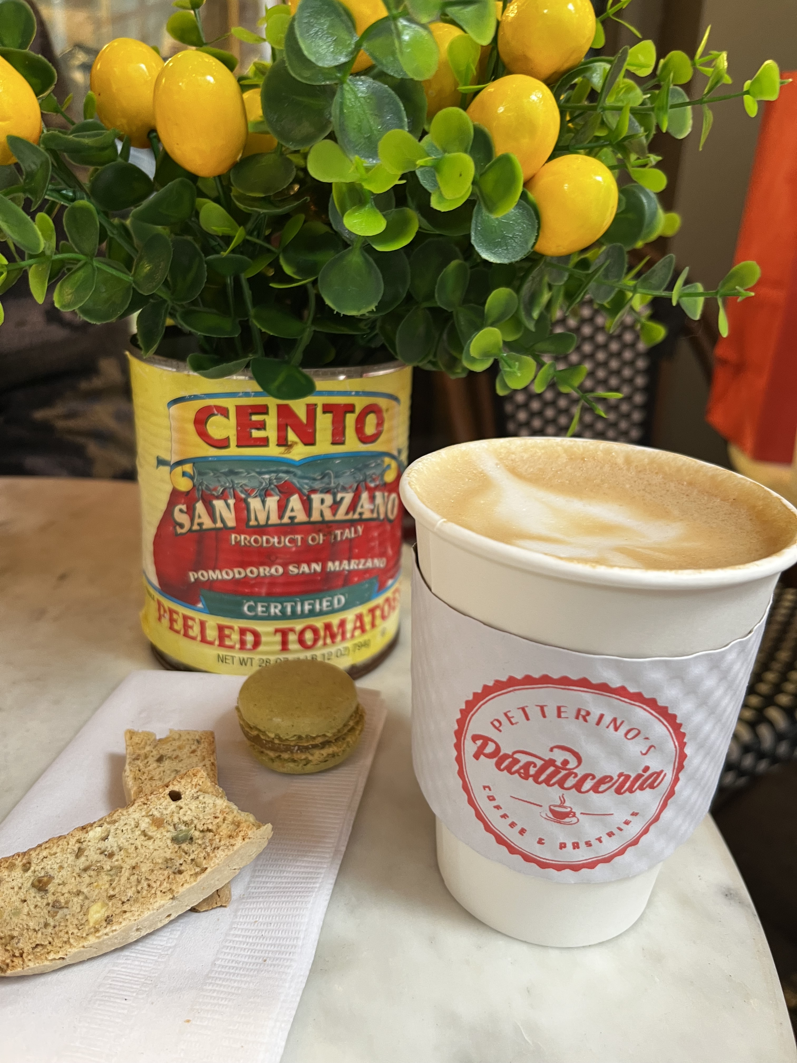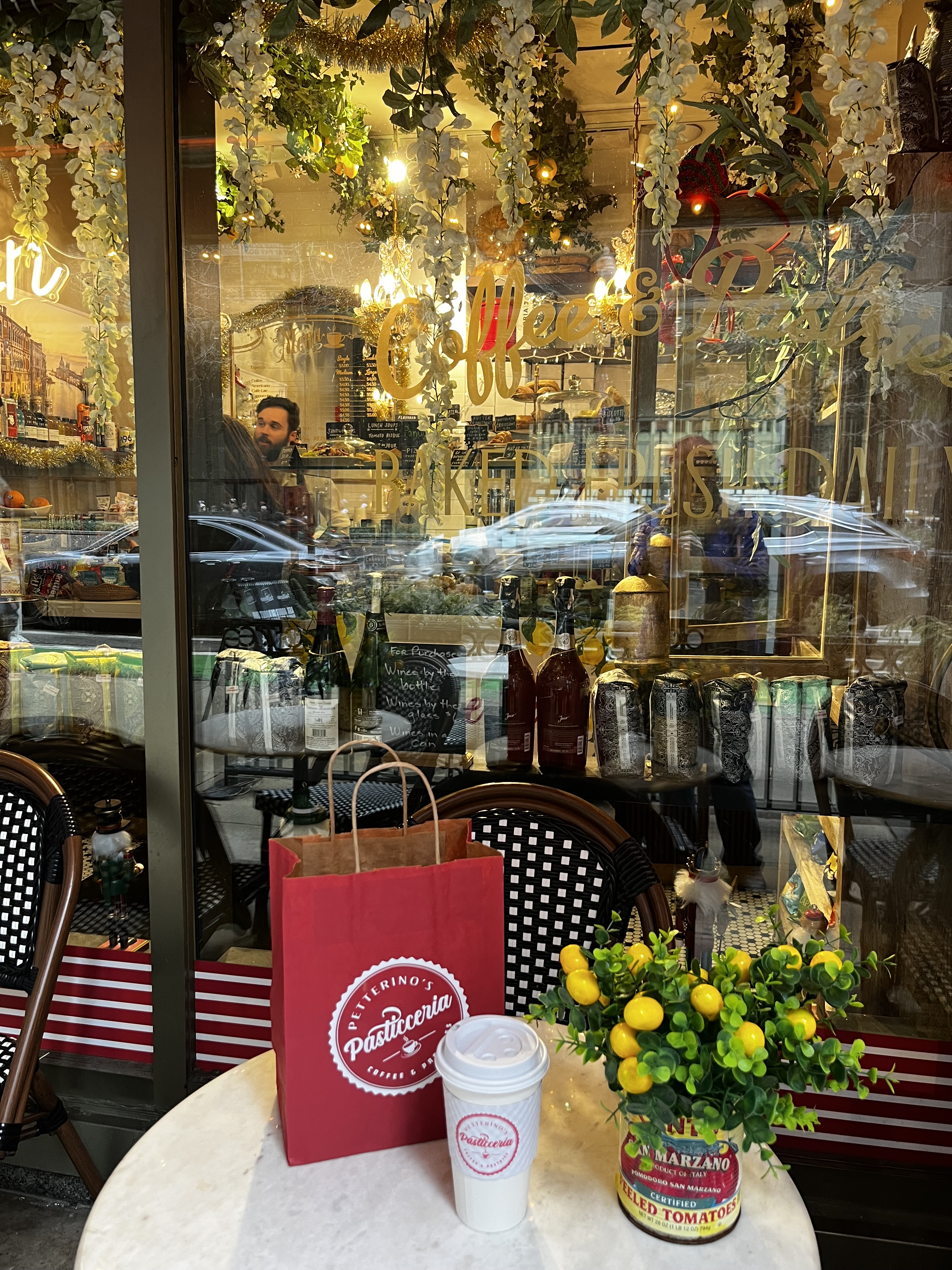 We wandered, looking at Christmas decorations under an overcast but still cheerful sky. We hoped to stop for a beat over some coffee and a sweet treat. If it was at a spot with this disclaimer, I’m in: “PASTRIES Selection of house-made pastries varies daily”. We eventually found just the right cafe and fed our cravings with a cappuccino, cannoli, biscotti, and a pistachio macaroon at Petterino’s Pasticceria.