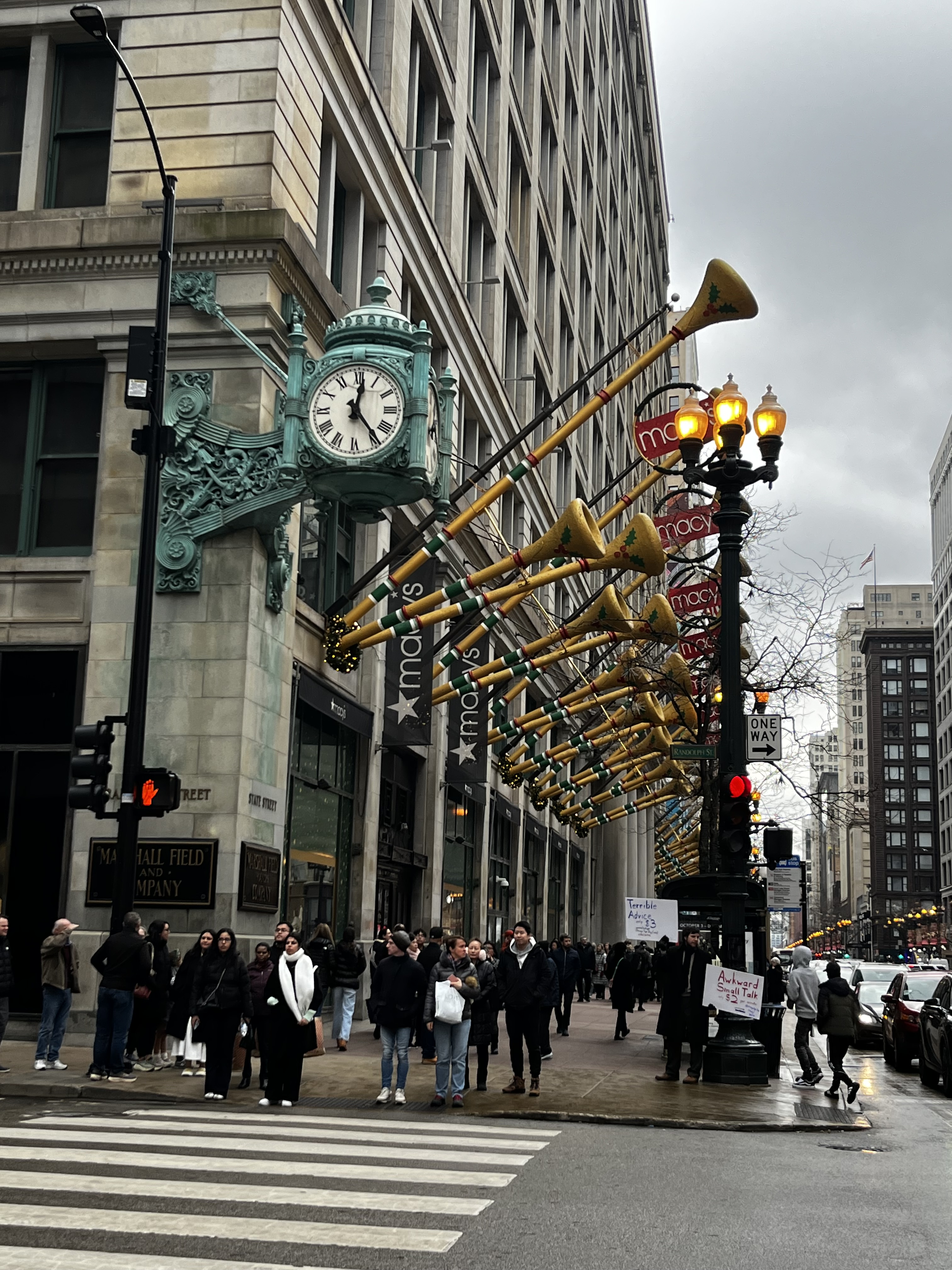 “Meet me under the clock” in Chicago refers to the iconic bronze clock at Marshall Field’s, on the corner of State Street and Washington. It’s a historic meeting spot, from the age before cell phones, dropping pins on a map, and sending your loved ones your ETA electronically. For over a century folks have gathered here, making it a symbol of connection, tradition, and the lively spirit of downtown Chicago, especially during the holidays.