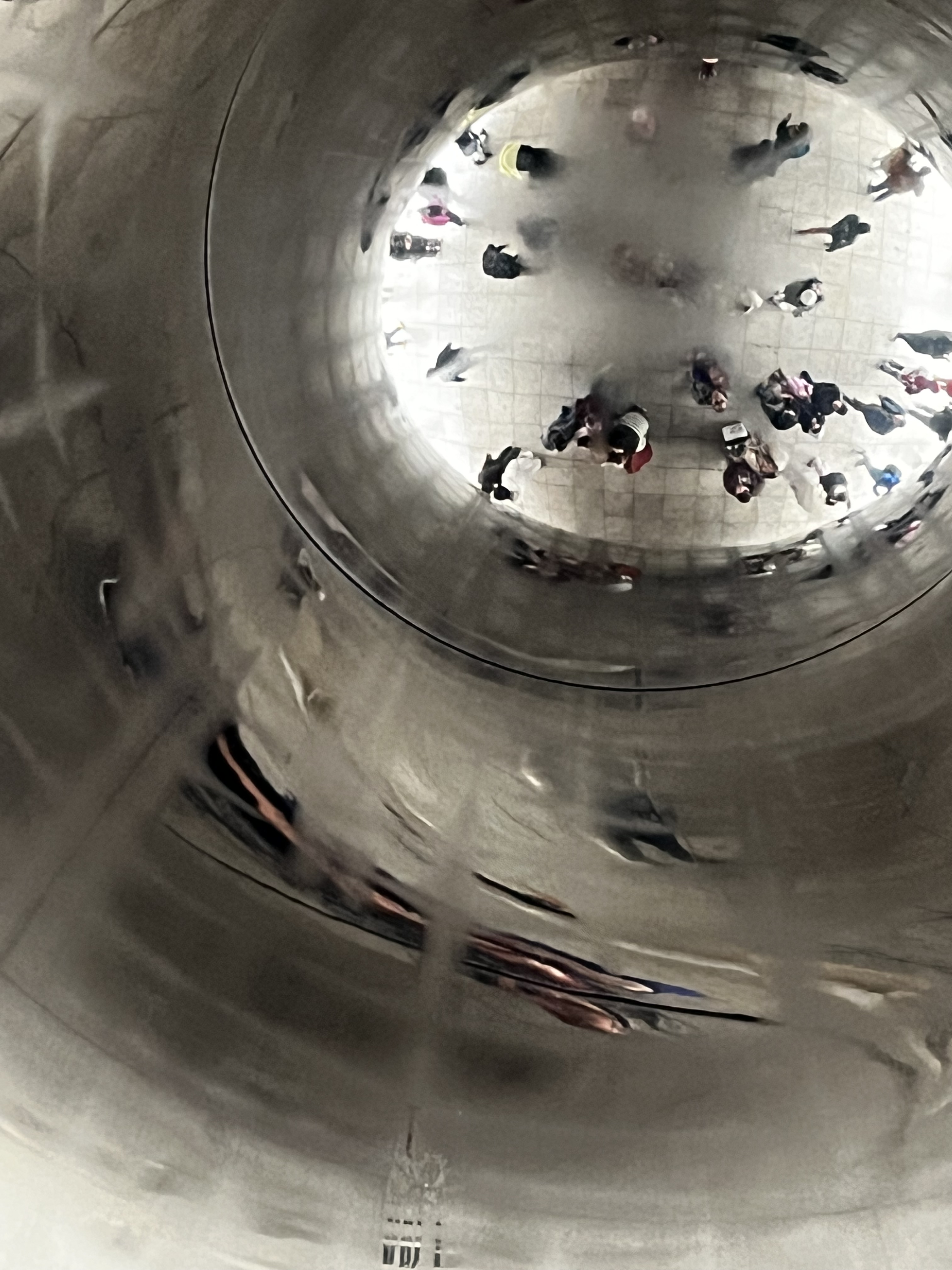 Stand under The Bean, and your reflection is squished and shrunken, in the style of ‘The Incredible Shrinking Woman.’ Maybe my reference is outdated. . . you remember Lily Tomlin, right? You’ve watched old school Saturday Night Live. At least I didn’t ask you to conjure up the original 1957 ‘The Incredible Shrinking Man’. He falls into a trash bin; Lily Tomlin slips into the kitchen sink and down into the garbage disposal, a distracted and absent-minded teenage daughter scraping food off her plate.