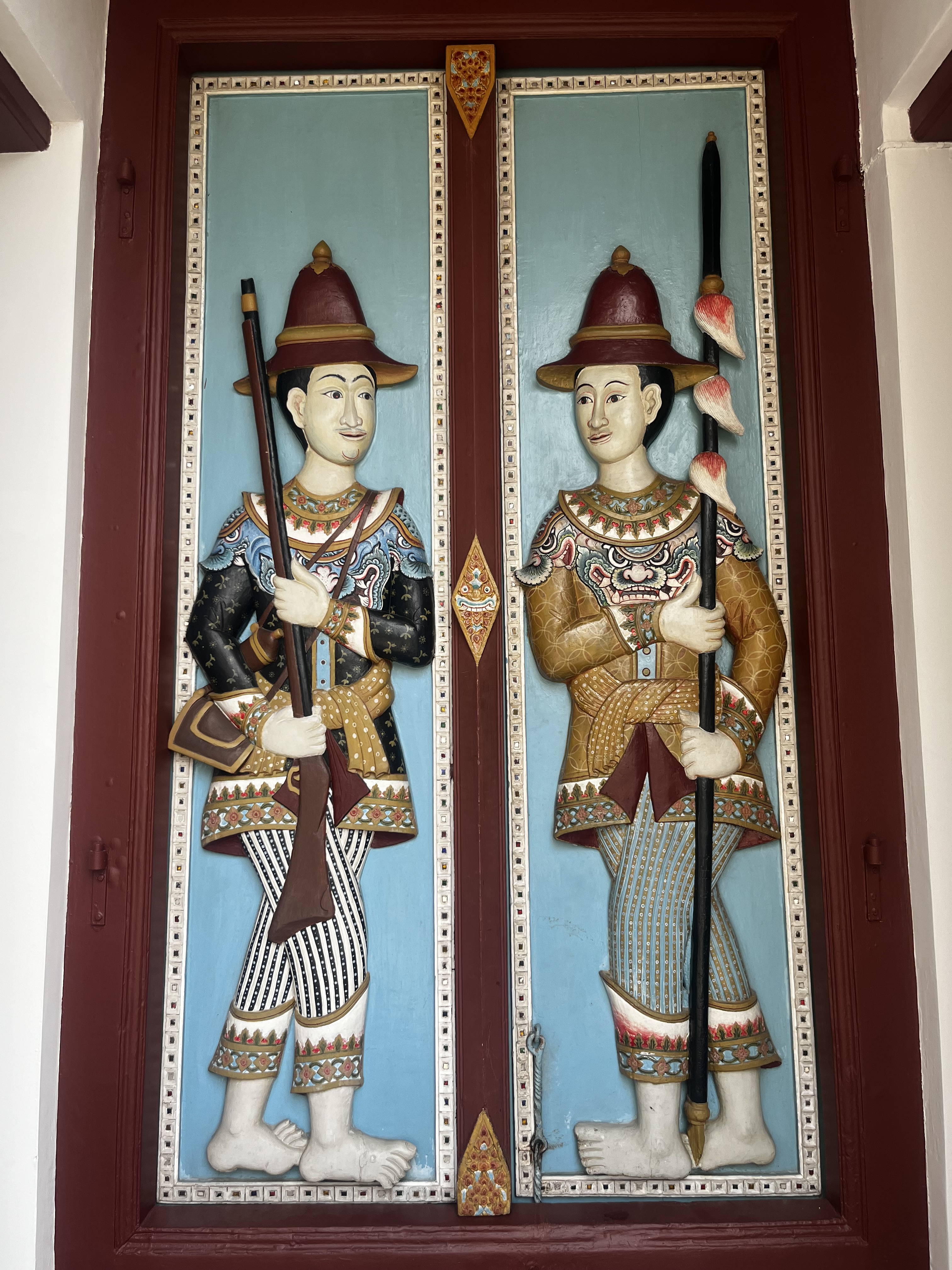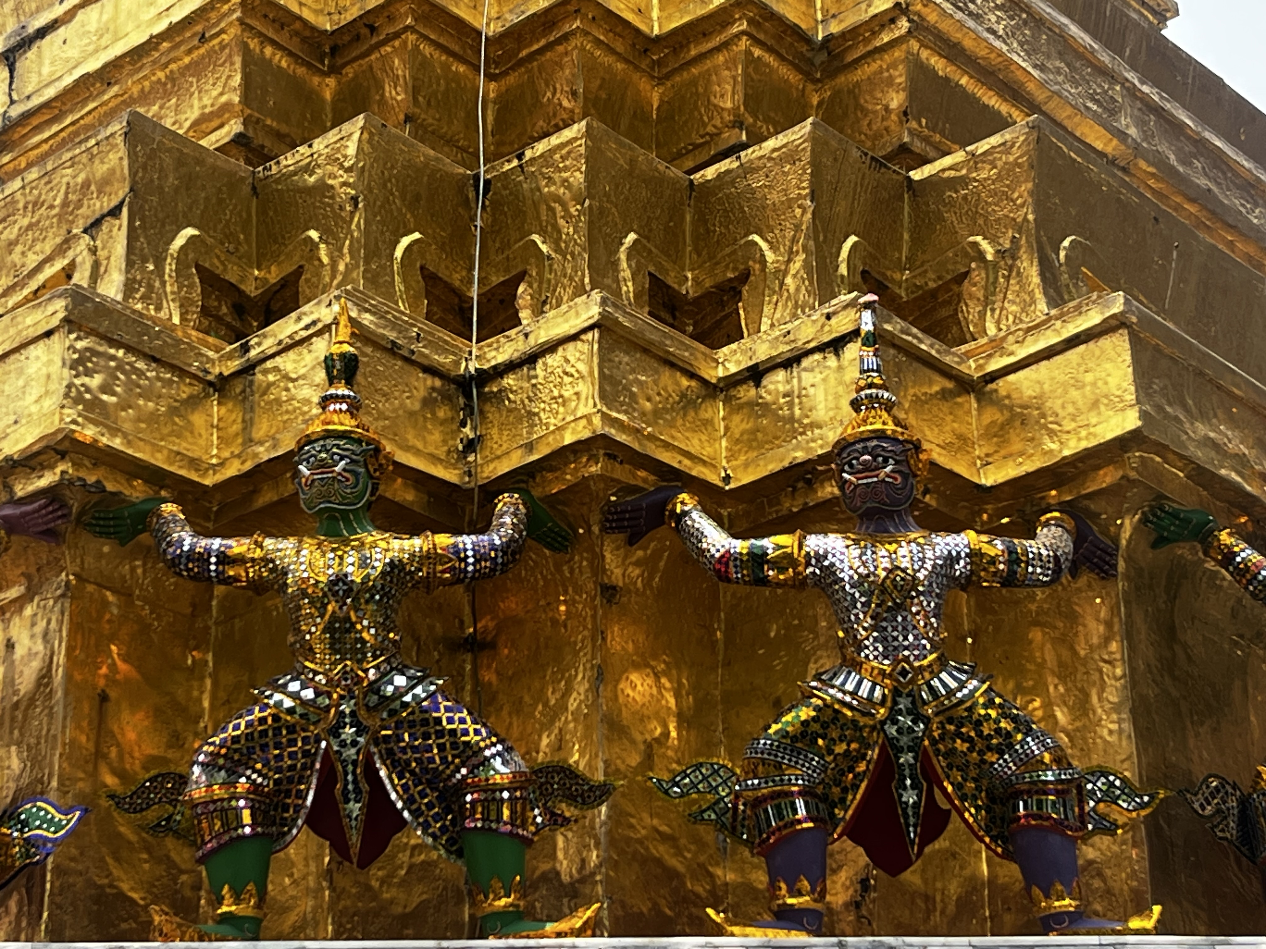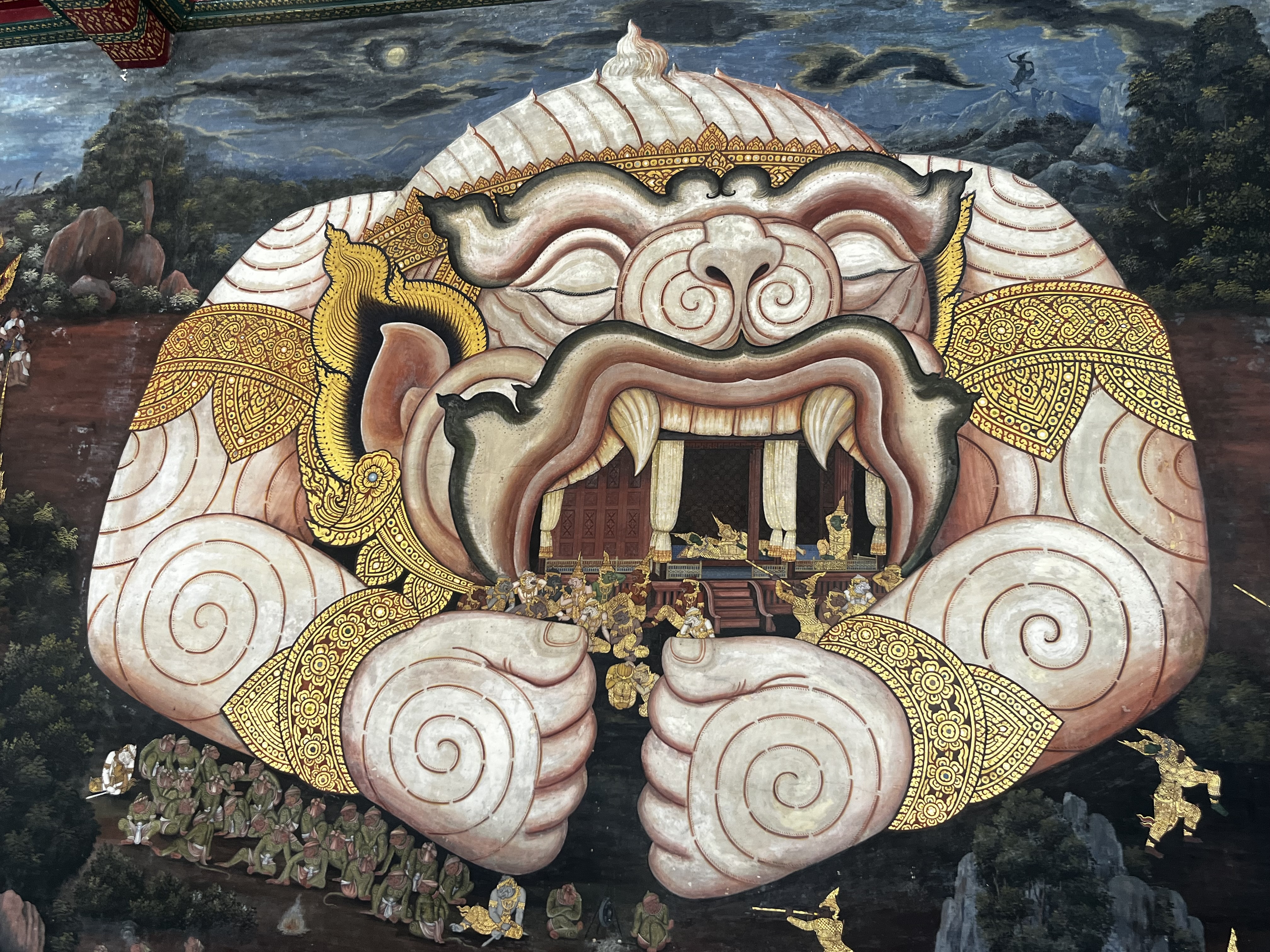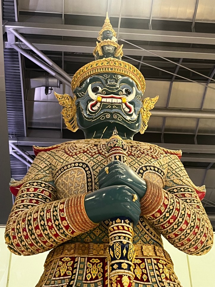 I was drawn to a certain half-human, half-elephant figure in the paintings, wondering if he was an attacker or a protector. His positioning and stance spoke of commitment to defense. He appeared again and again, towering statues standing guard outside of temple doors, at the ready. Days later I ran into him at the Bangkok airport, standing as tall as the terminal ceiling.
