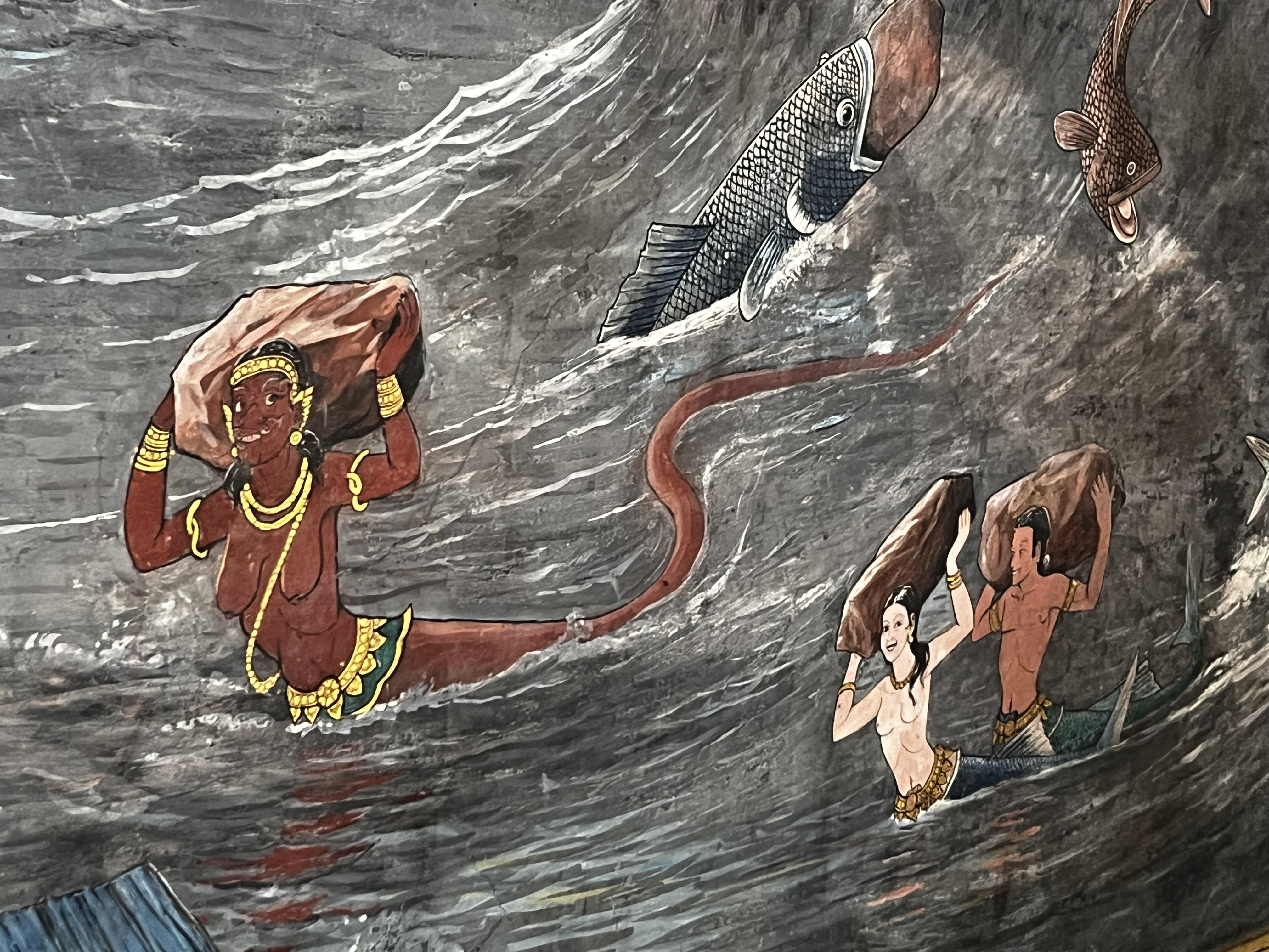 An intricate mural is painted on the wall that surrounds the golden temples. There is evidence of violence, invasion, and struggle. There is evidence of loving protection, defense, and victory over evil. A visitor could get lost in a single panel of the painting. One might decide to order a print of a small section of the mural as a wedding gift, to hang in their home and contemplate from time to time. Curiosity is definitely awakened.
