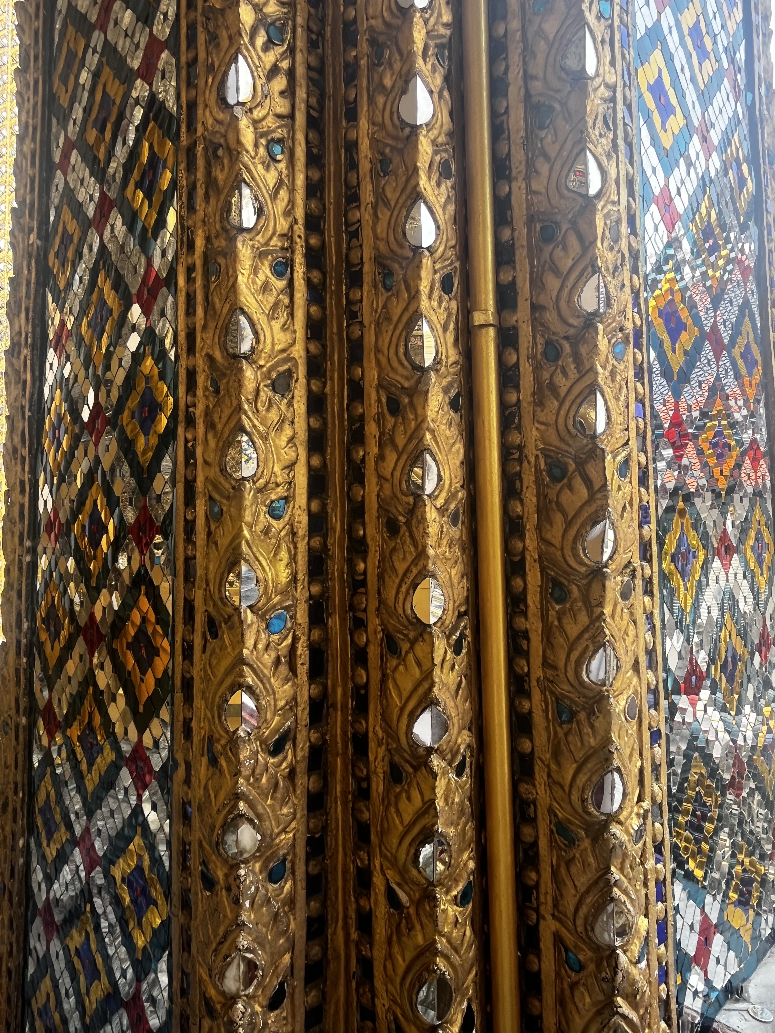 “Built in accordance with traditional Thai style architecture with multi-tiered roofs of coloured tiles with finials, roof ridges, and lotus-captal pillars this building of brick and white washed plaster has exterior walls that are decorated with gilt and coloured glass mosaics fashioned into geometric patterns.” (Grand Palace website)