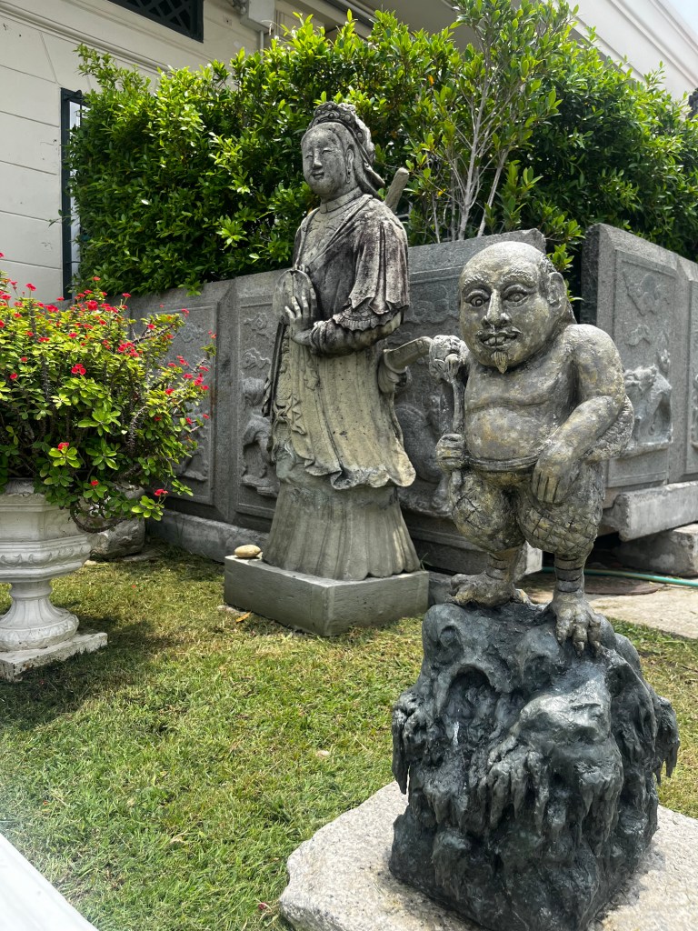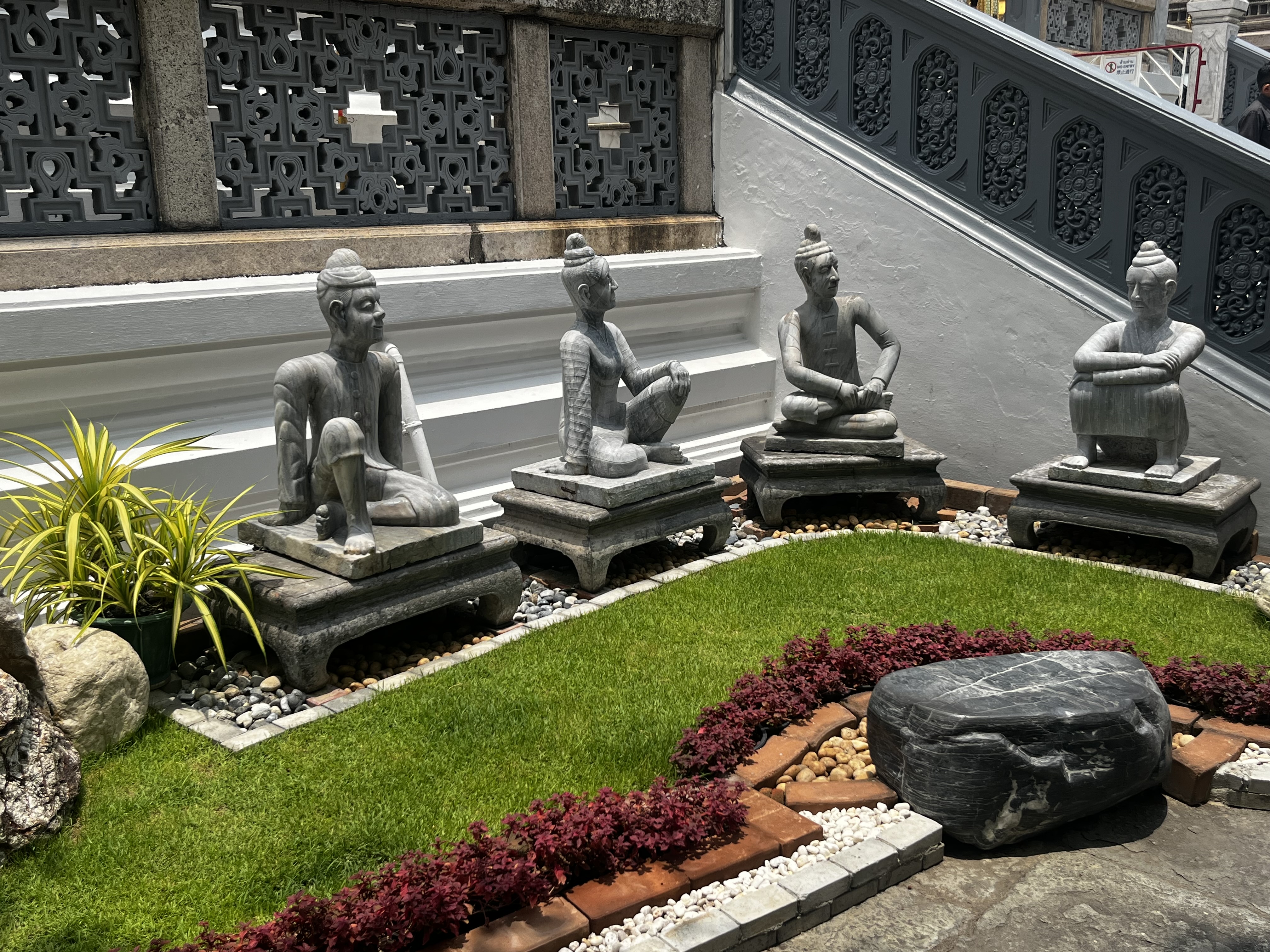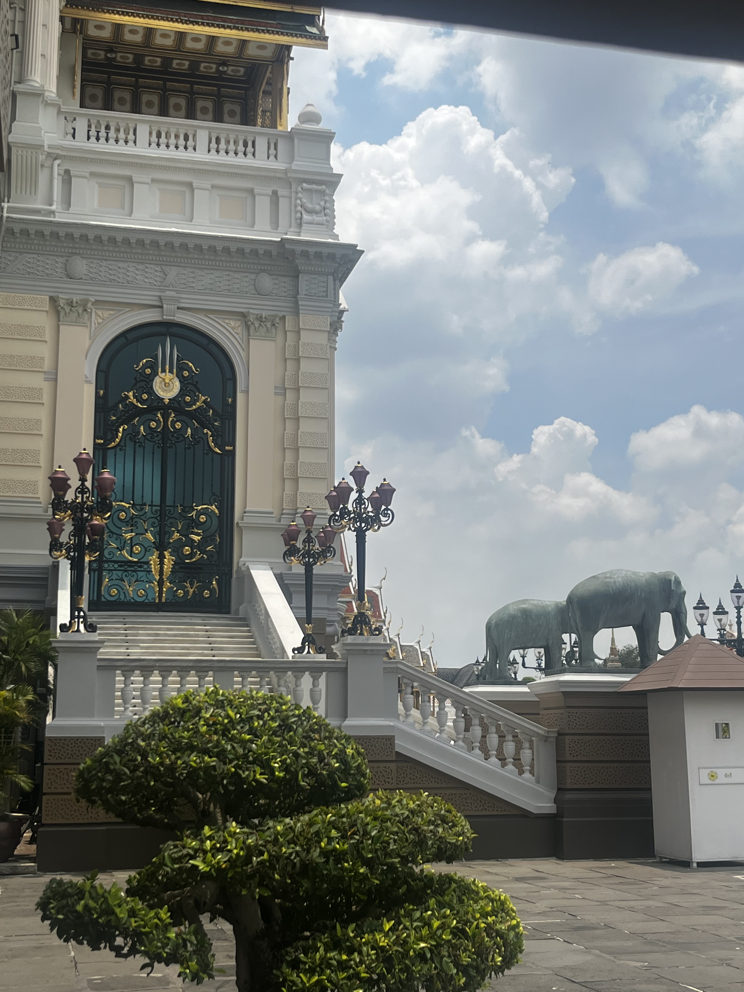 Some areas of the Grand Palace complex, on the outskirts, stand in contrast to the wash of gold in the main temple areas. On the way to the exits of the complex there are fountains, large stretches of green grass, and intricately adorned white buildings with just a touch of gold trim. Dark green glass and large statues of elephant guardians give me a sense of stability and calm, in comparison to the high-frequency energy of the areas of the palace I’ve just exited. I can breathe a little easier. I notice the blue skies and puffy white clouds. It’s still stiflingly hot, but there are fewer tourists crowded together. The feeling of this place is less claustrophobic. It’s beautiful!